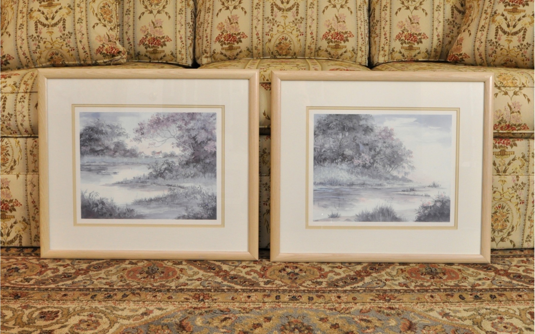 Muted colors, blond wood frames, 19 1/2" x 22 1/2".