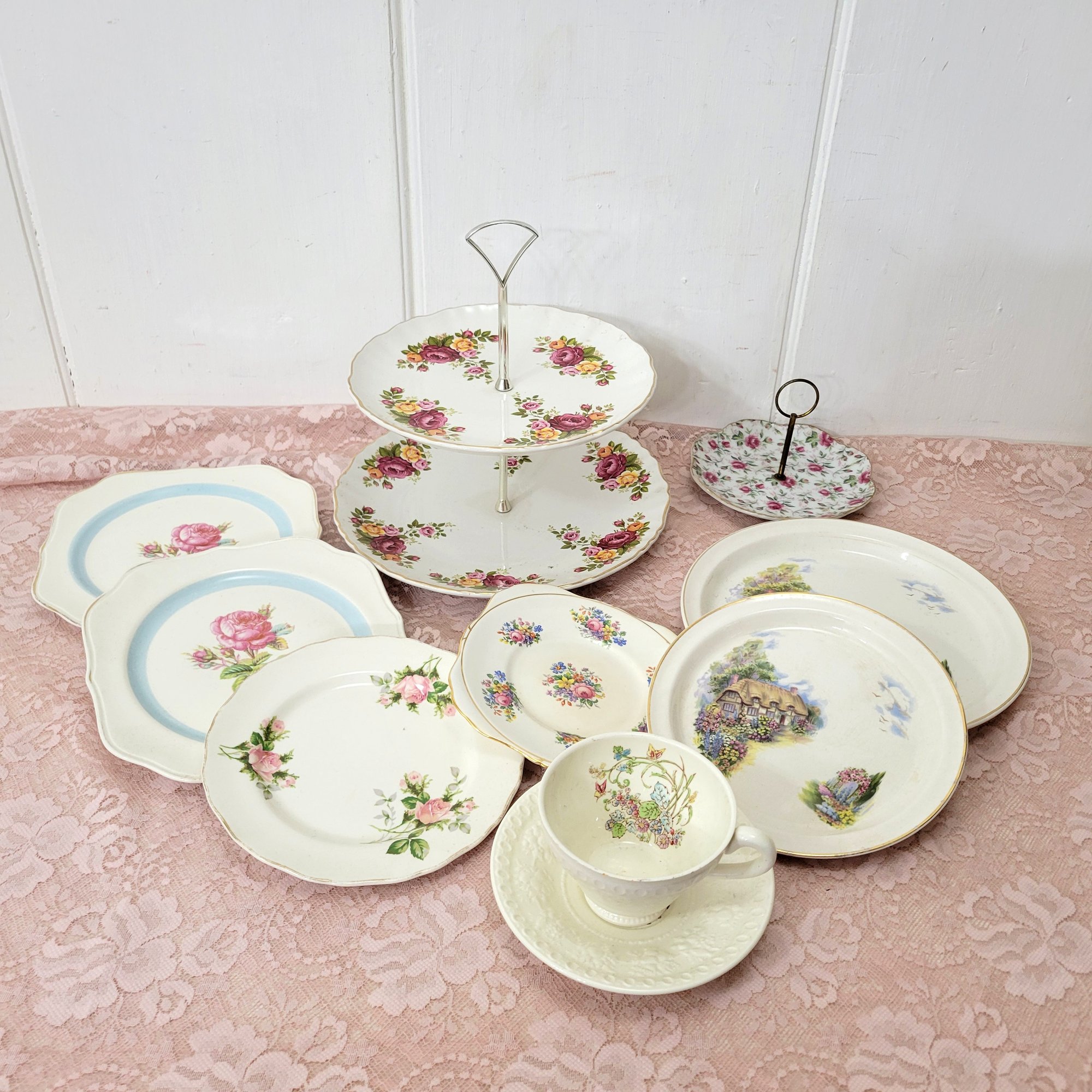 A lot of Shabby Chic china plates.