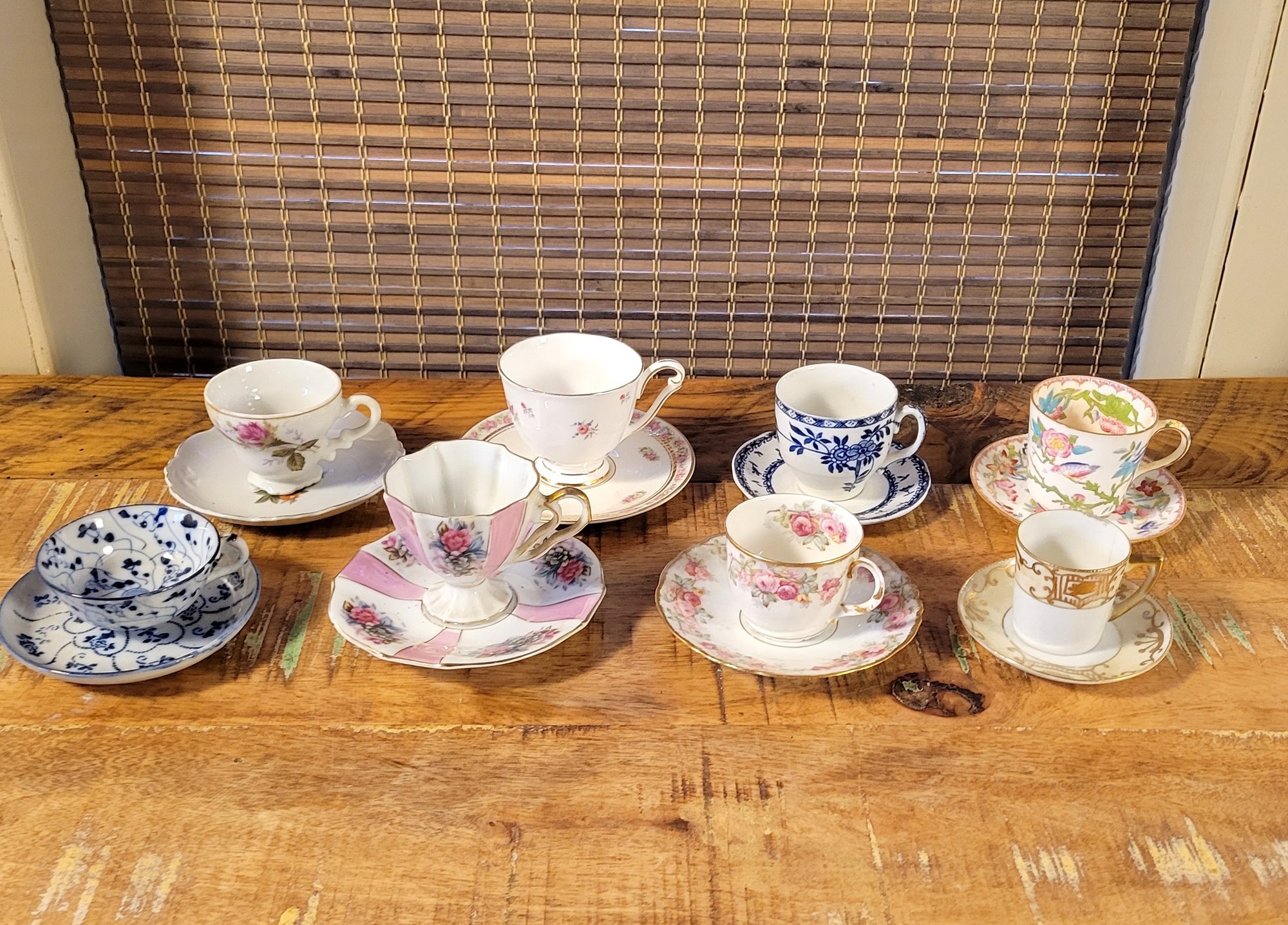 Not all matched sets but complimentary. Two cups have hairline cracks.