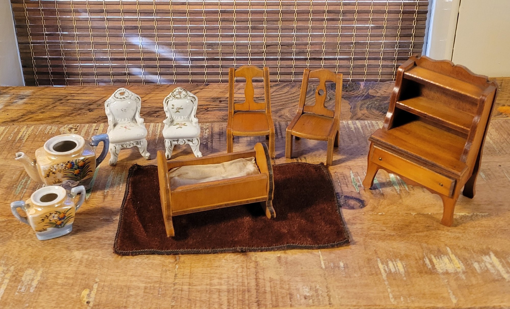 The wood bookcase has a broken back leg and the teapot is chipped.