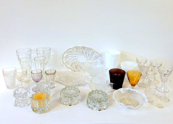 An odd lot of glass - votive candle holders, plates, glassware, etc. Please see photos.