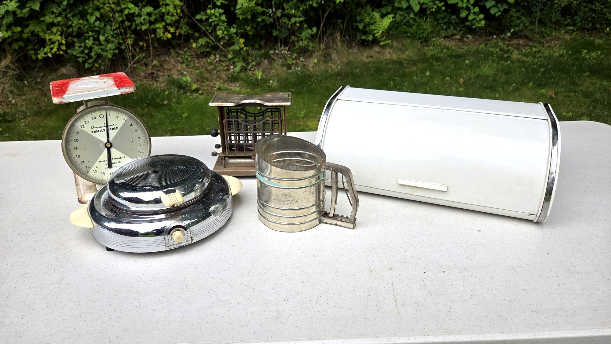 Bread box, scale, toaster, waffle maker, flour sifter. Electric items have no power cards and are untested. Interesting collectibles, decor, or props lot.