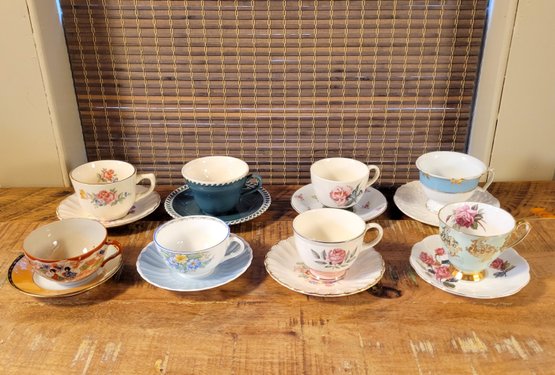 Eight sets of teacups and saucers. Most are not exact matches for the cups and saucers but they are complimentary. Fun for a tea party.