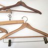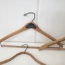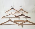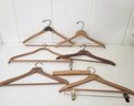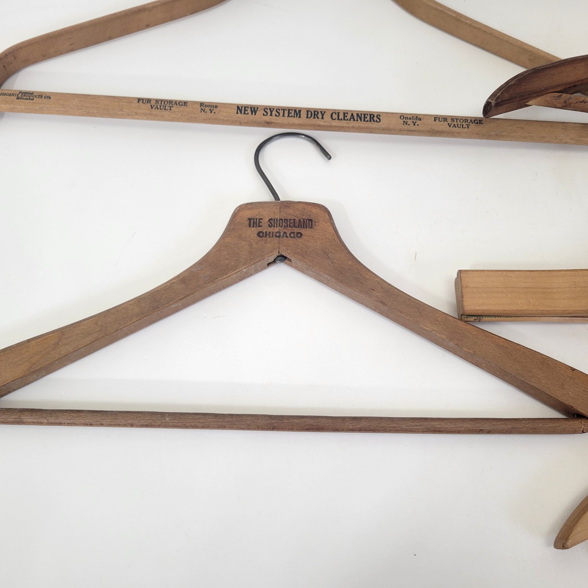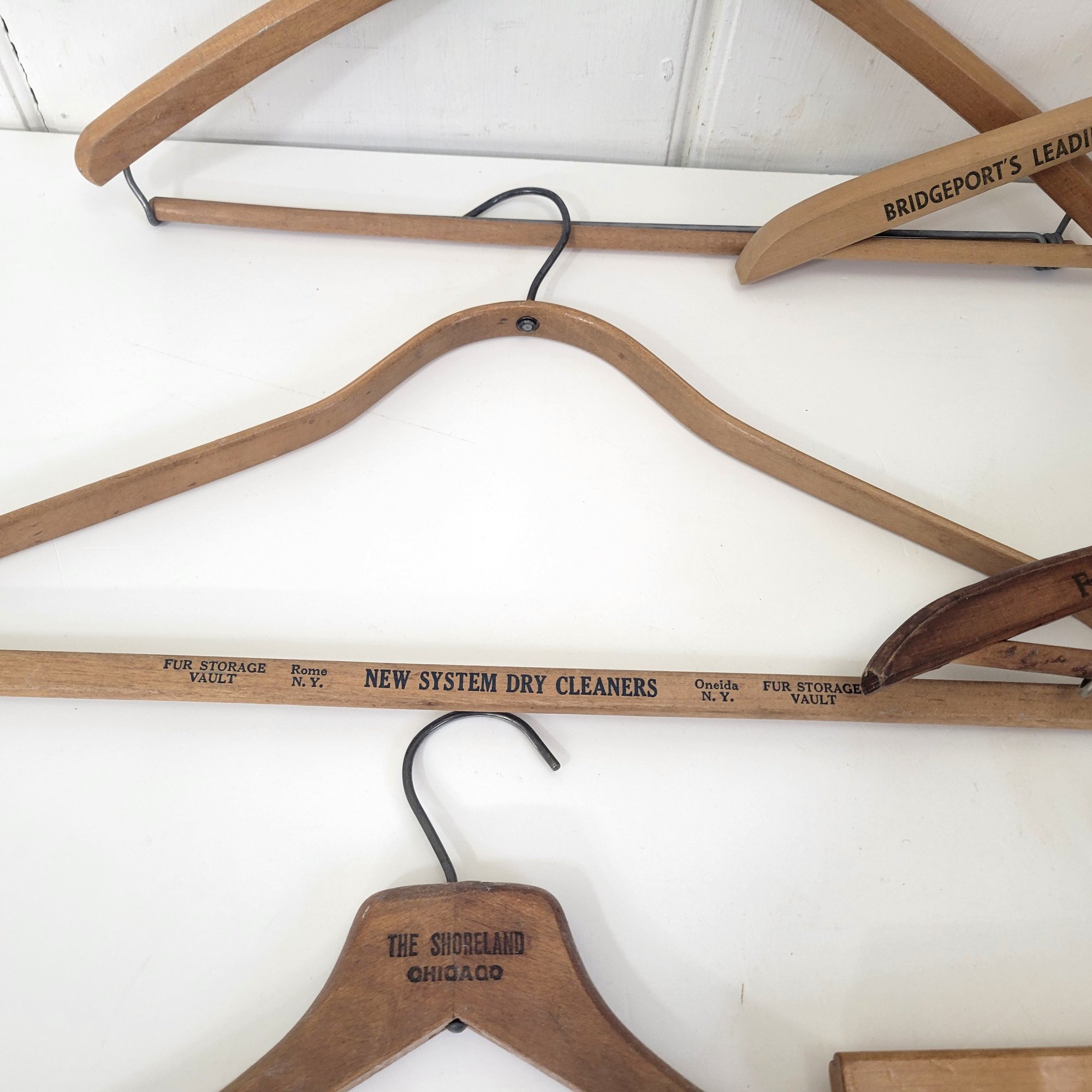 Seven wood hangers, five with advertising.