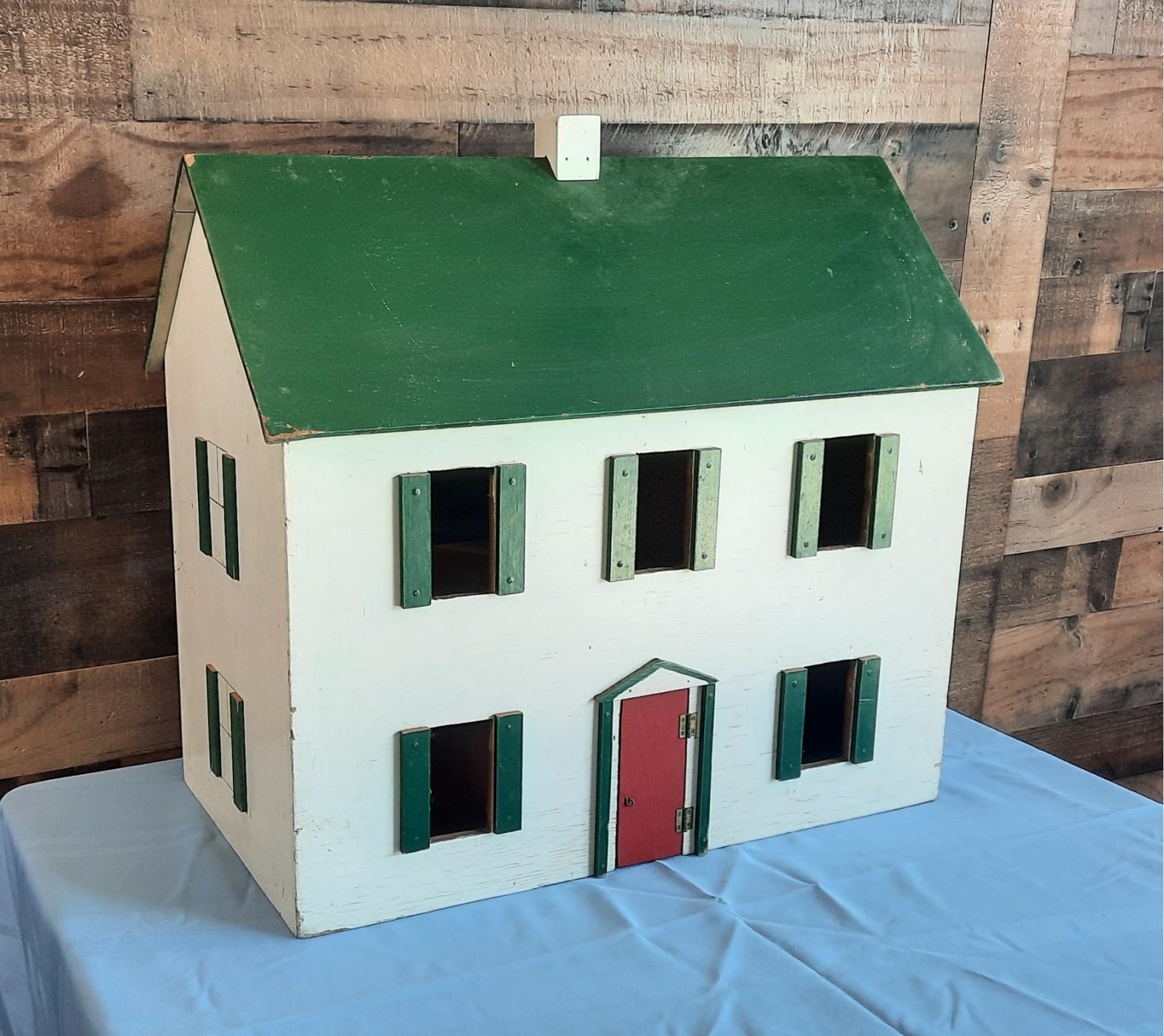 An adorable real wood vintage doll house with movable wall dividers. The roof folds up to reveal the attic.