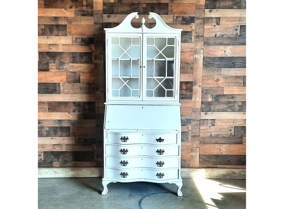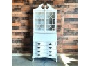 Lots of wear and tear and a missing piece of trim on the glass door. Great as is for a Shabby Chic decor piece or paint and repair to your liking.