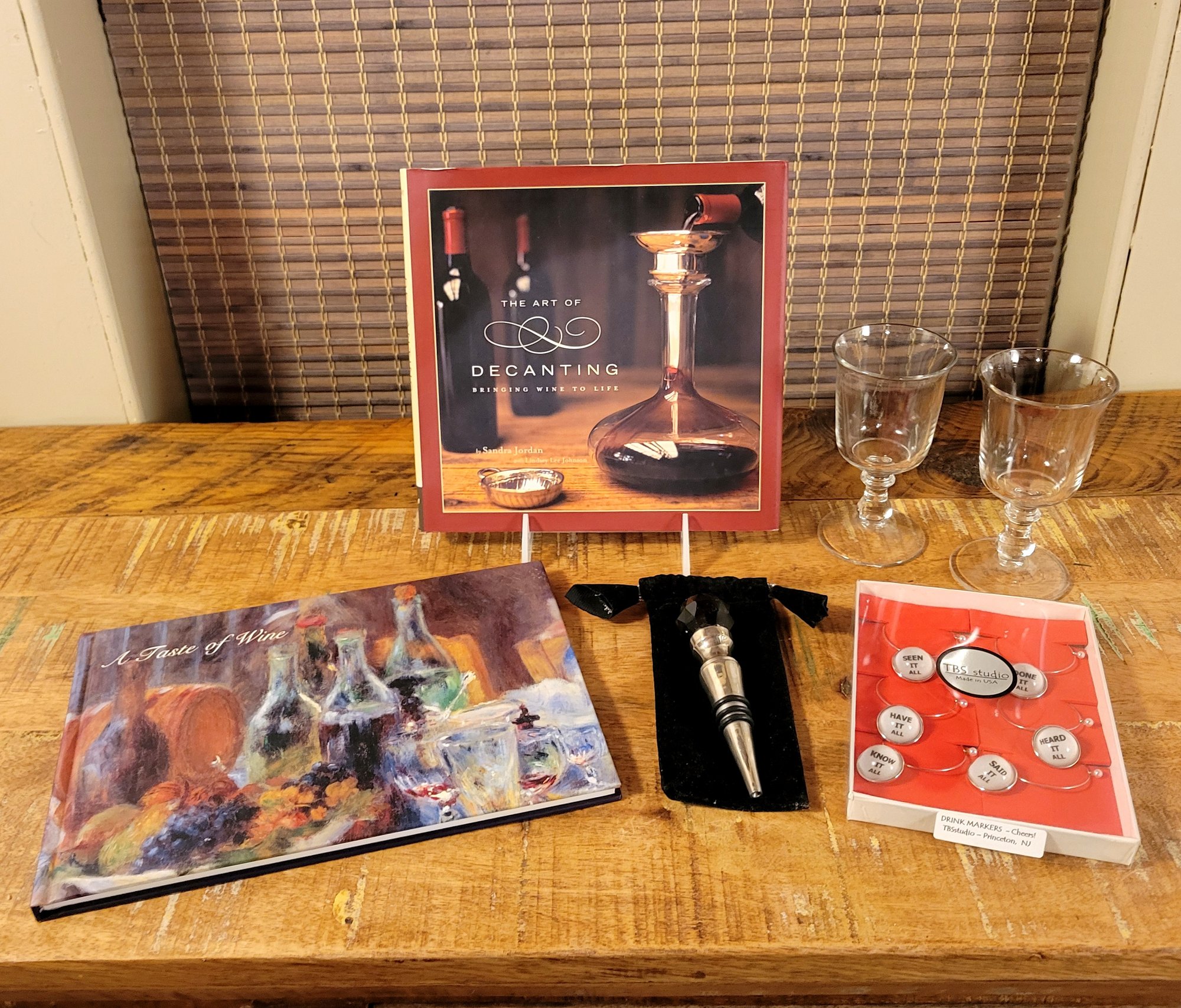 A book on the art of decanting, a record book to note favorite wines and pages for saving their labels, a decorative bottle stopper, wine charms, unopened, and two small vintage wine glasses.