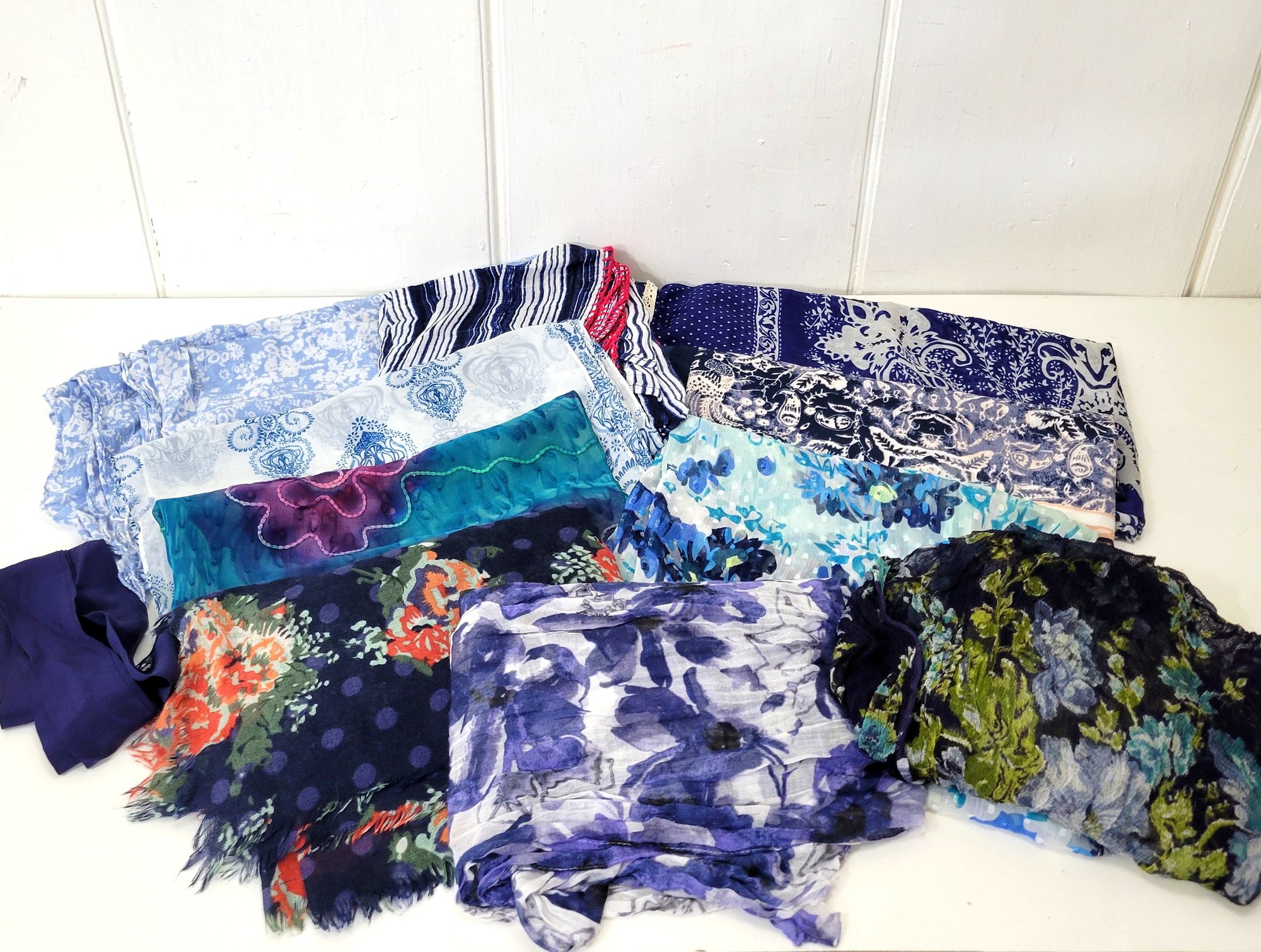 A large lot of women's scarves, assorted patterns and sizes, mostly blues.