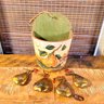 Flat back wood 1/2 round bucket decoupaged with a fruit design and 4 brass pear shaped ornaments.