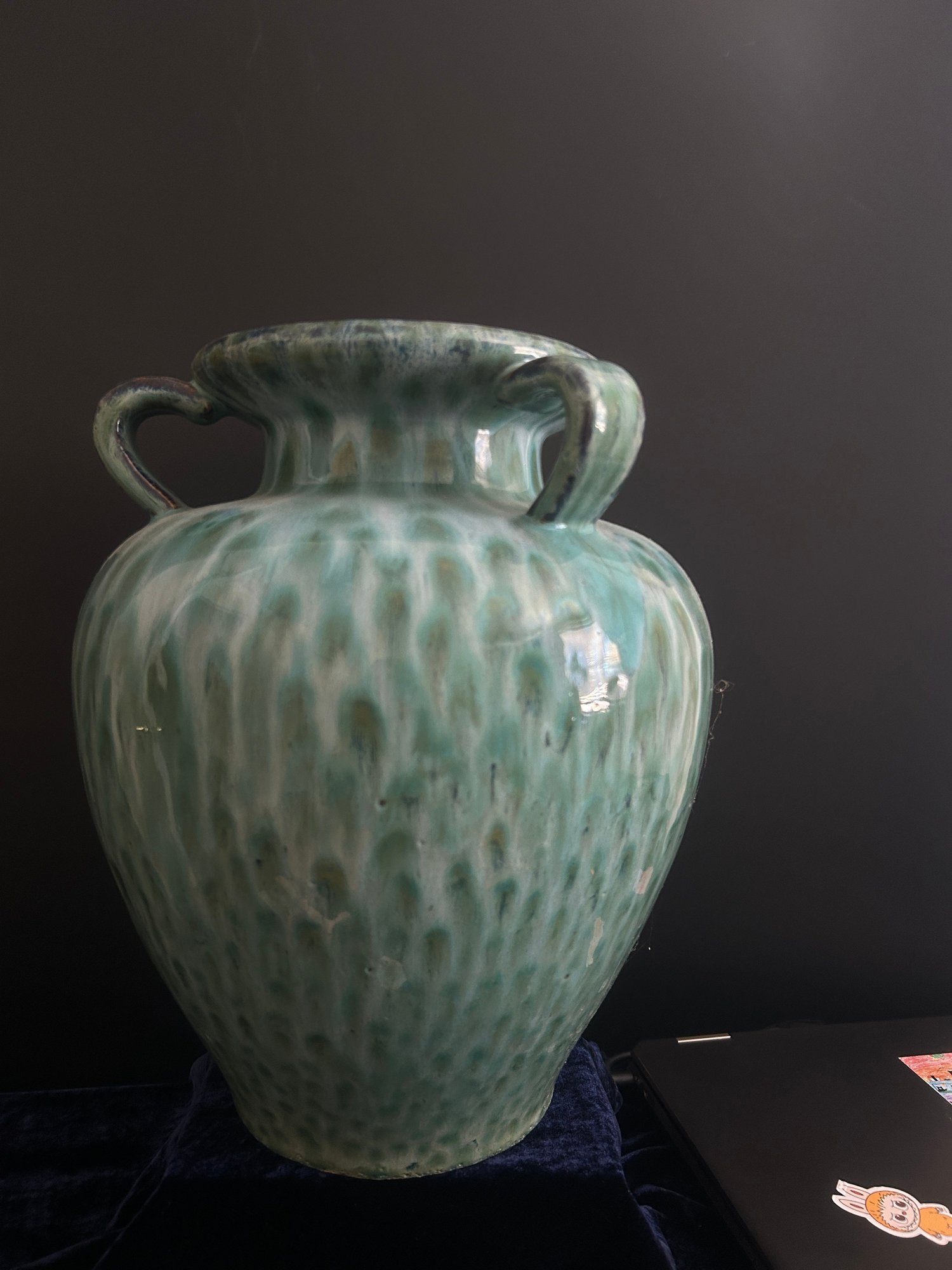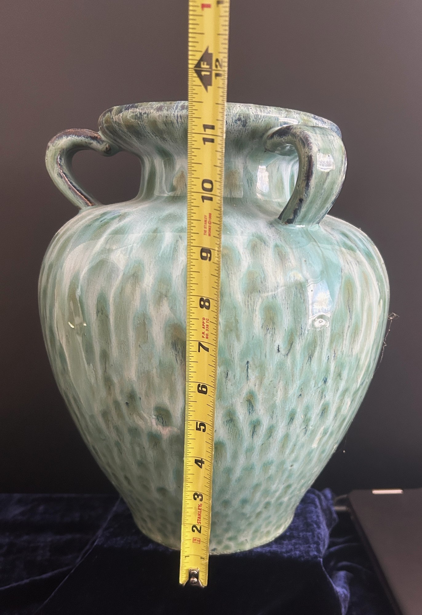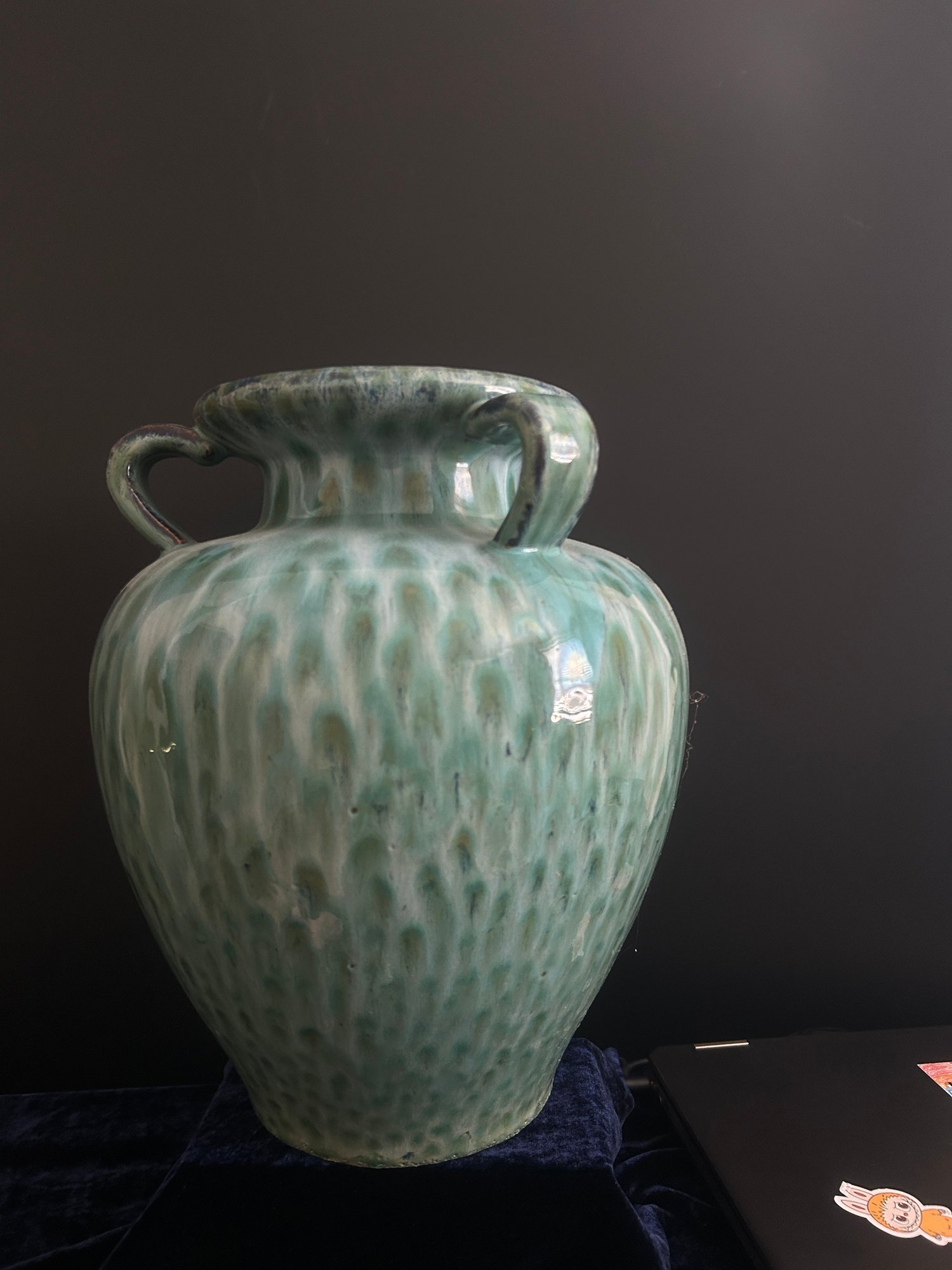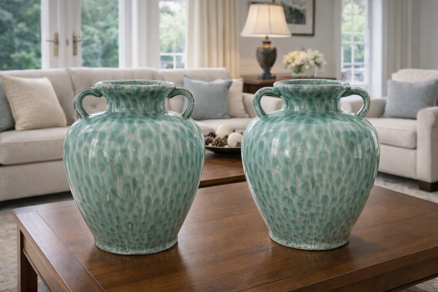 Pair of large decorative green glazed ceramic vases with double handles. Features a beautiful flowing drip glaze in shades of green and cream. Elegant shape with wide mouth and classic form. Perfect for tabletop, console table, or entryway display.