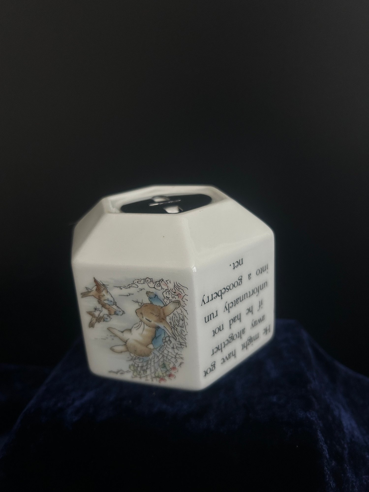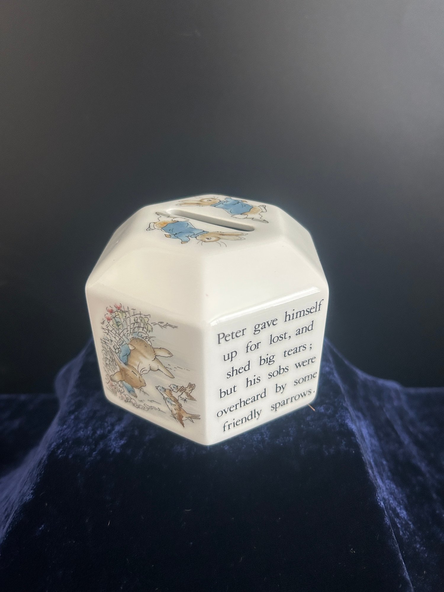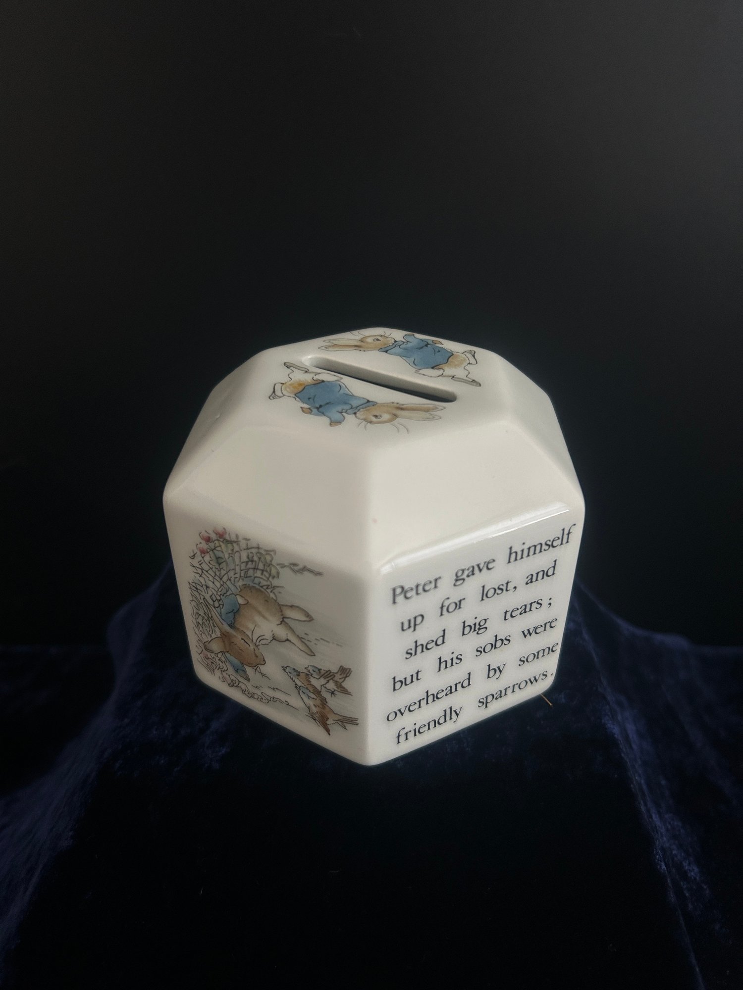 Charming ceramic coin bank featuring classic Beatrix Potter “Peter Rabbit” illustrations on multiple panels. The faceted geometric form is decorated with soft, storybook-style artwork and printed literary text, including a scene of Peter Rabbit with sparrows and garden imagery.