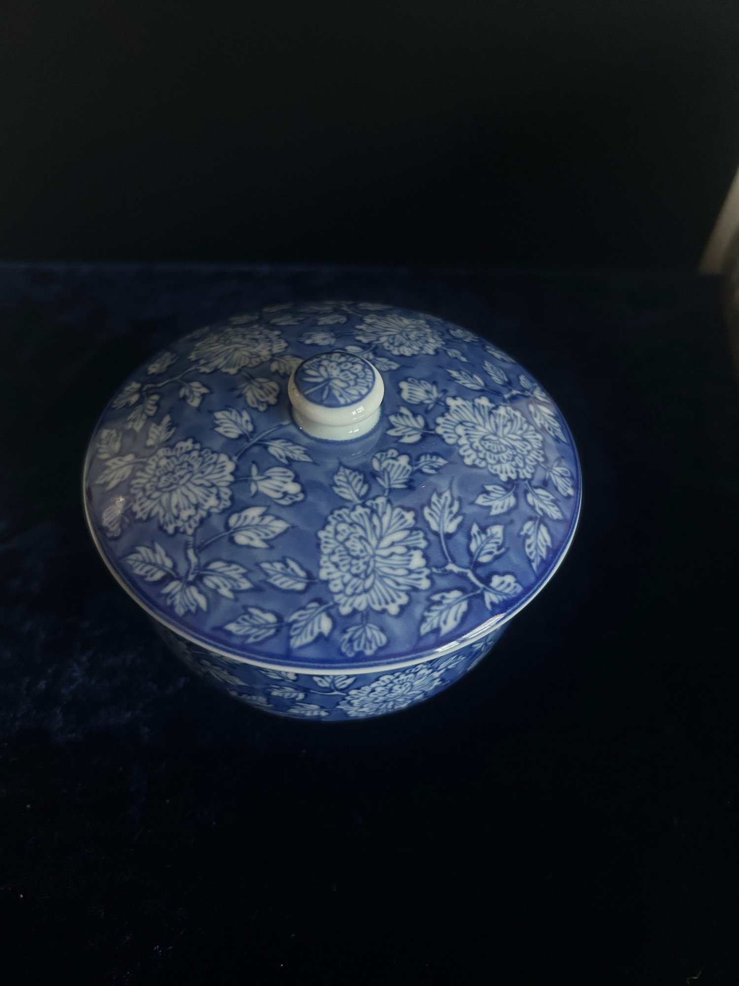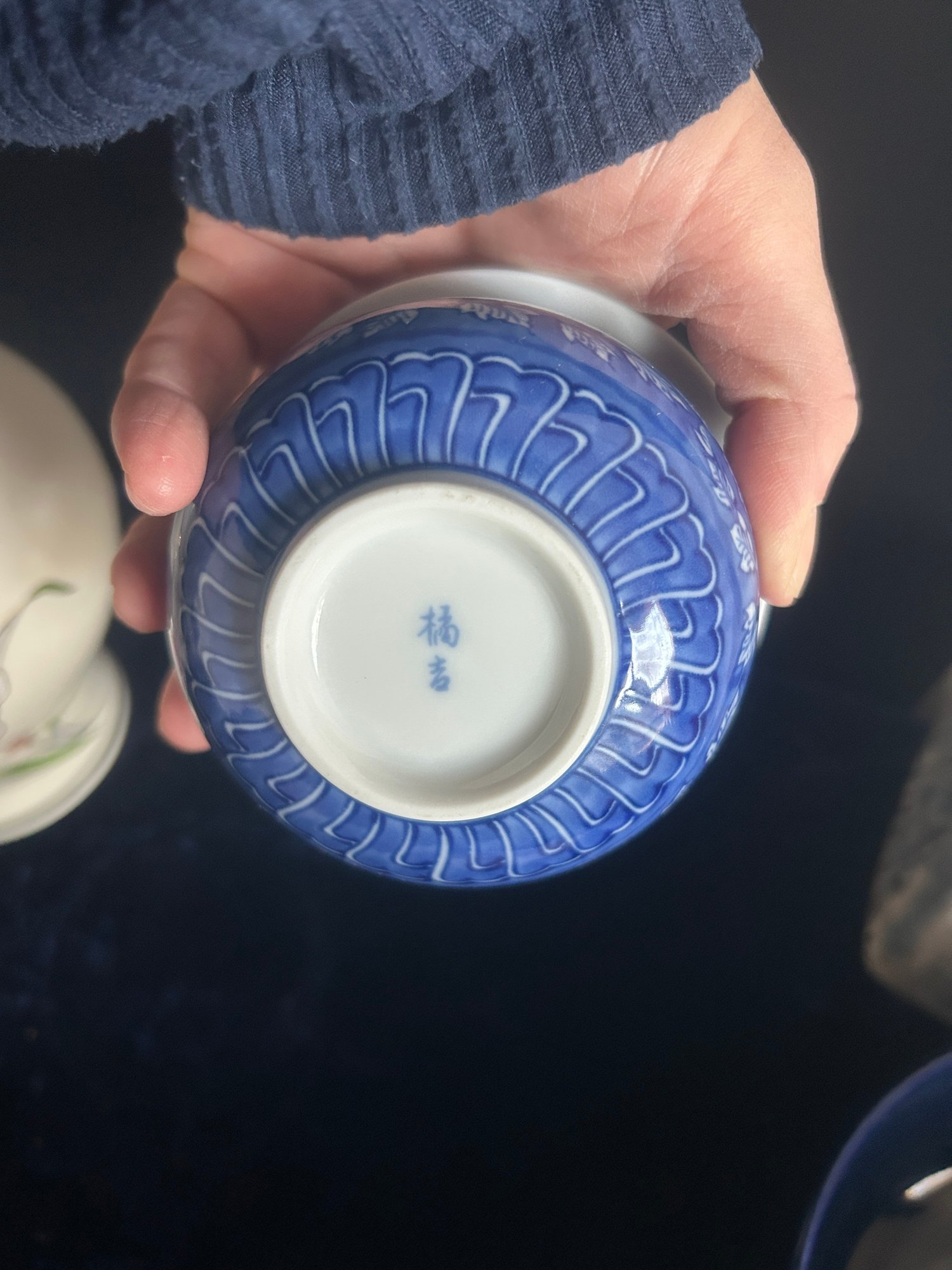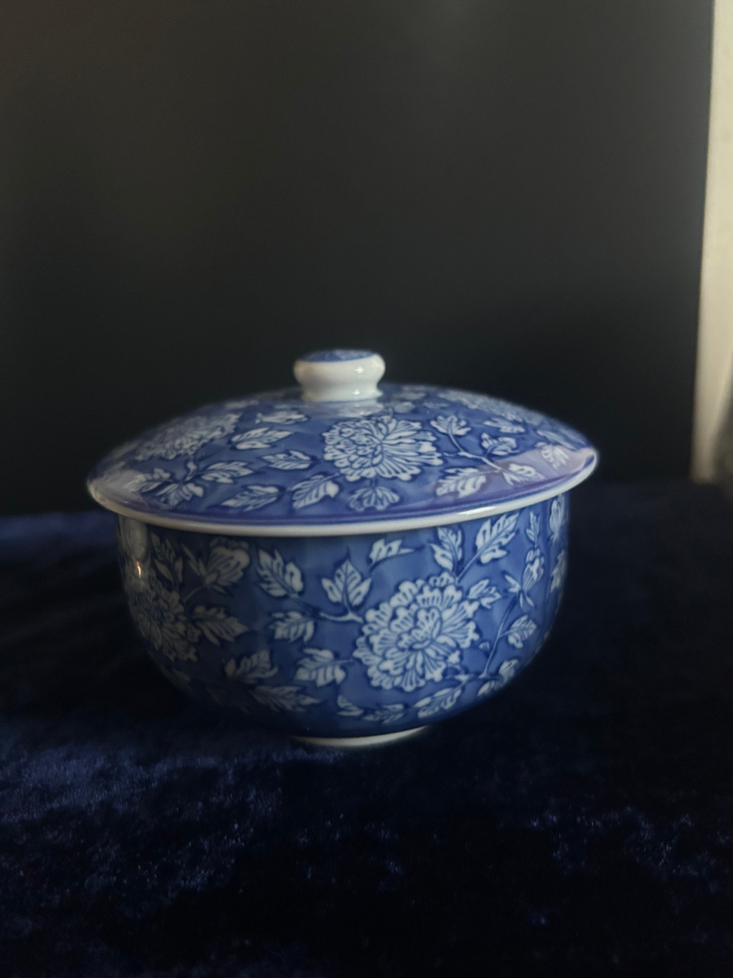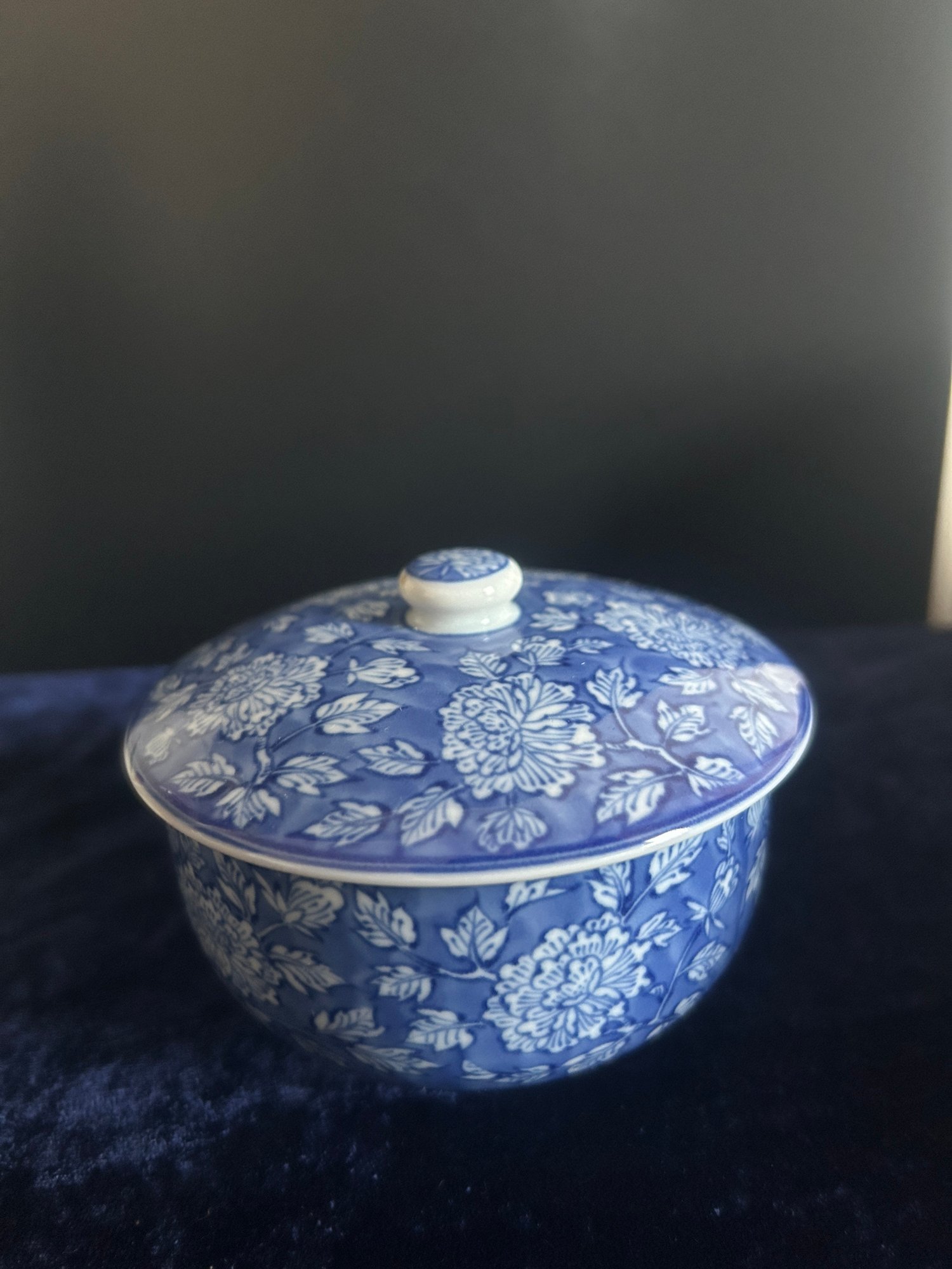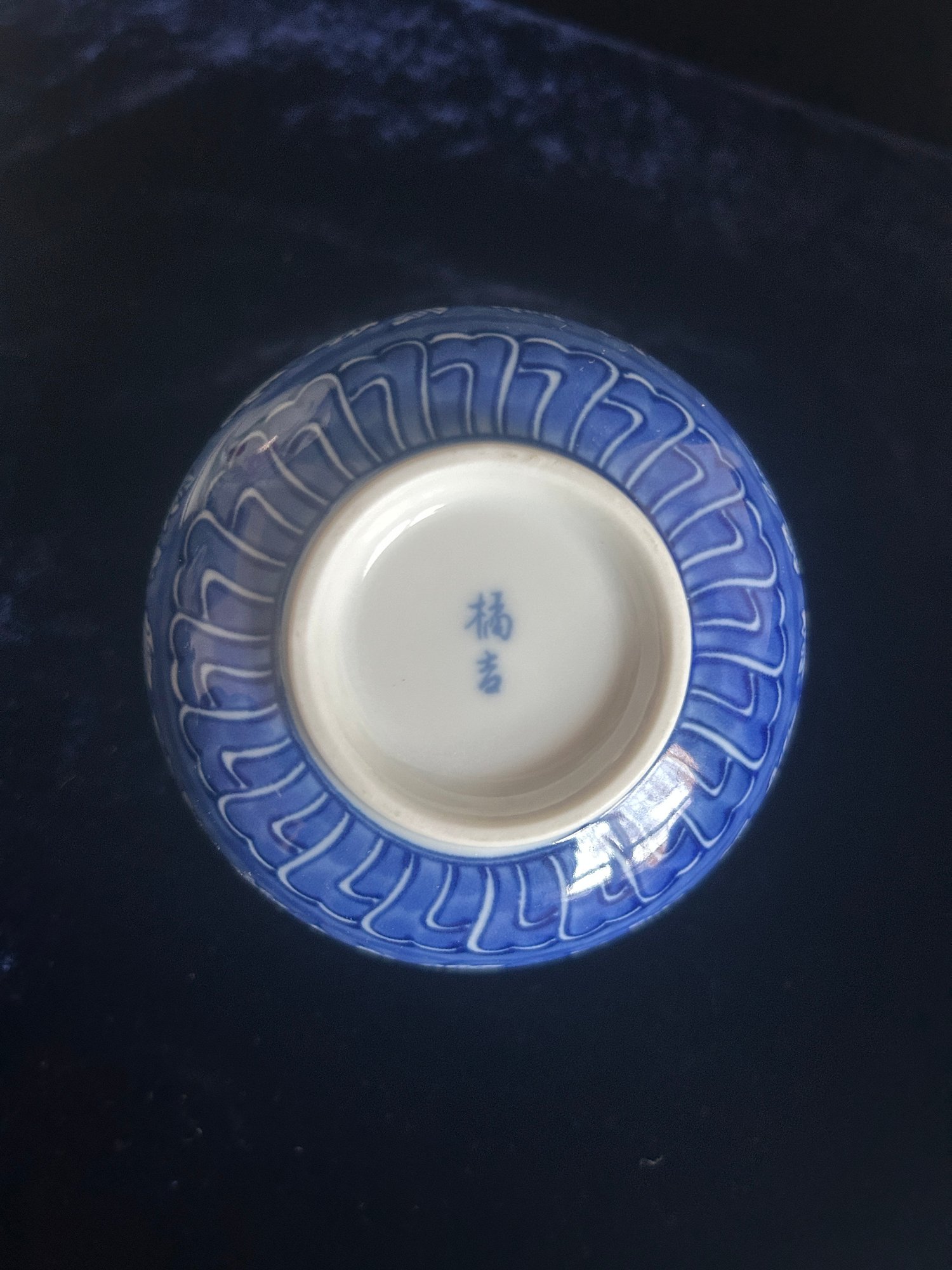 Blue and white porcelain bowl decorated with repeating floral motifs around the exterior. The interior is plain with a smooth white glaze. The underside bears a blue painted mark.