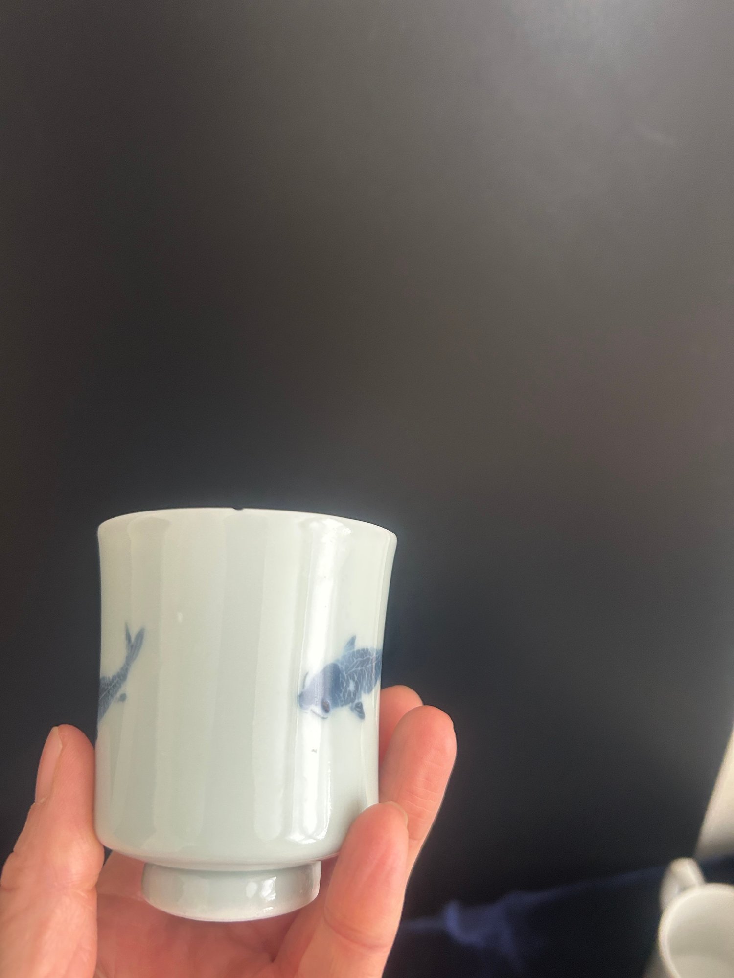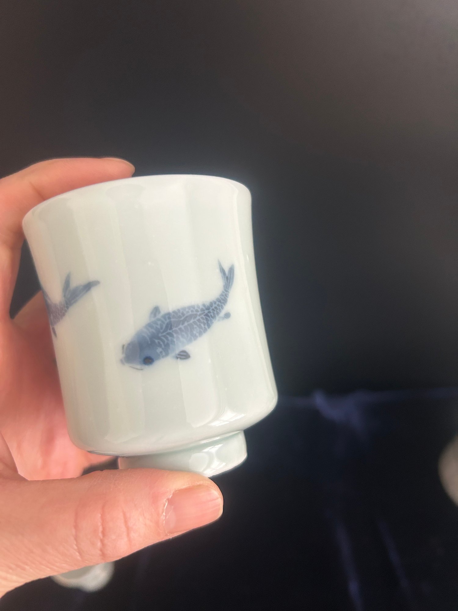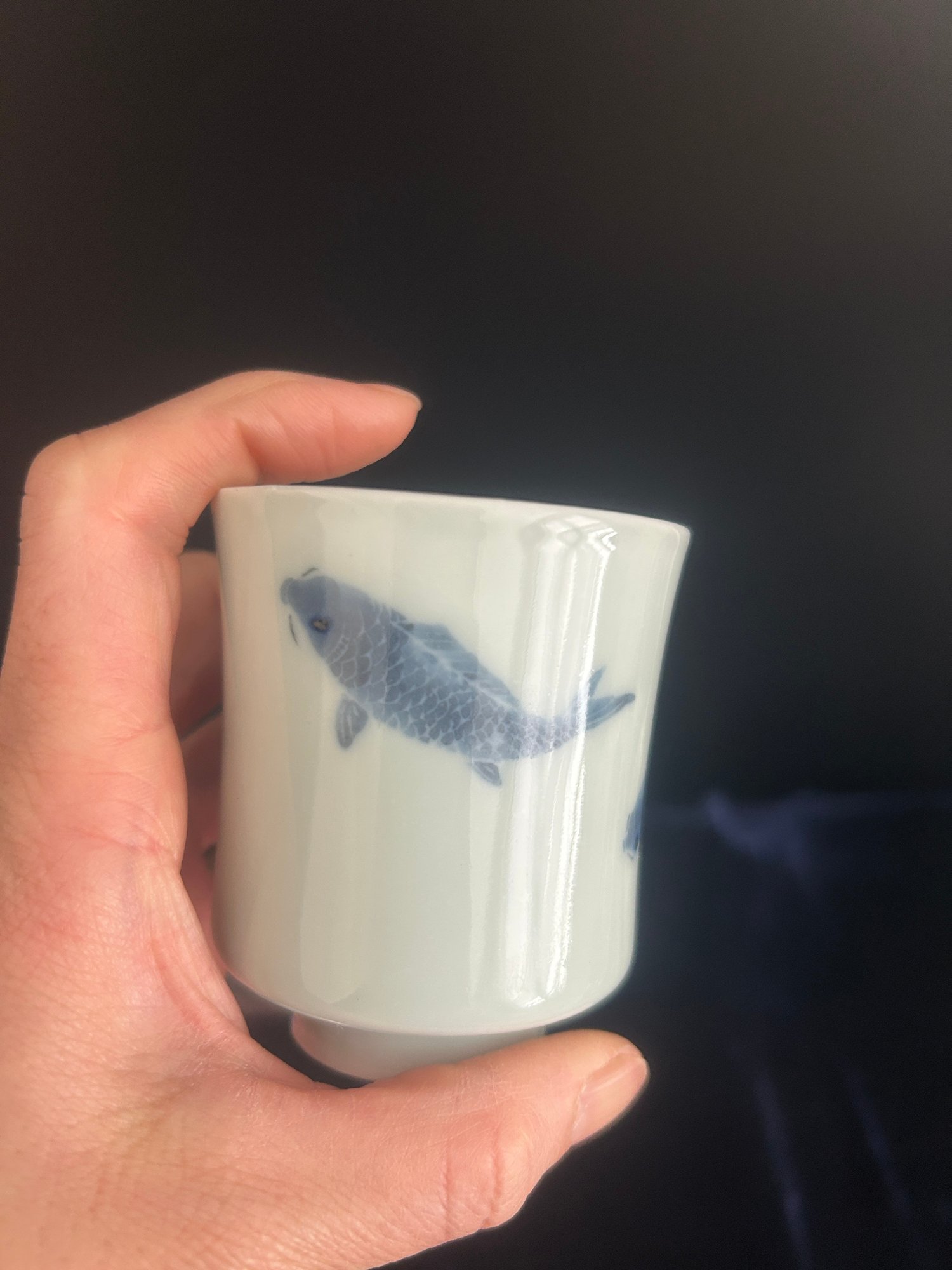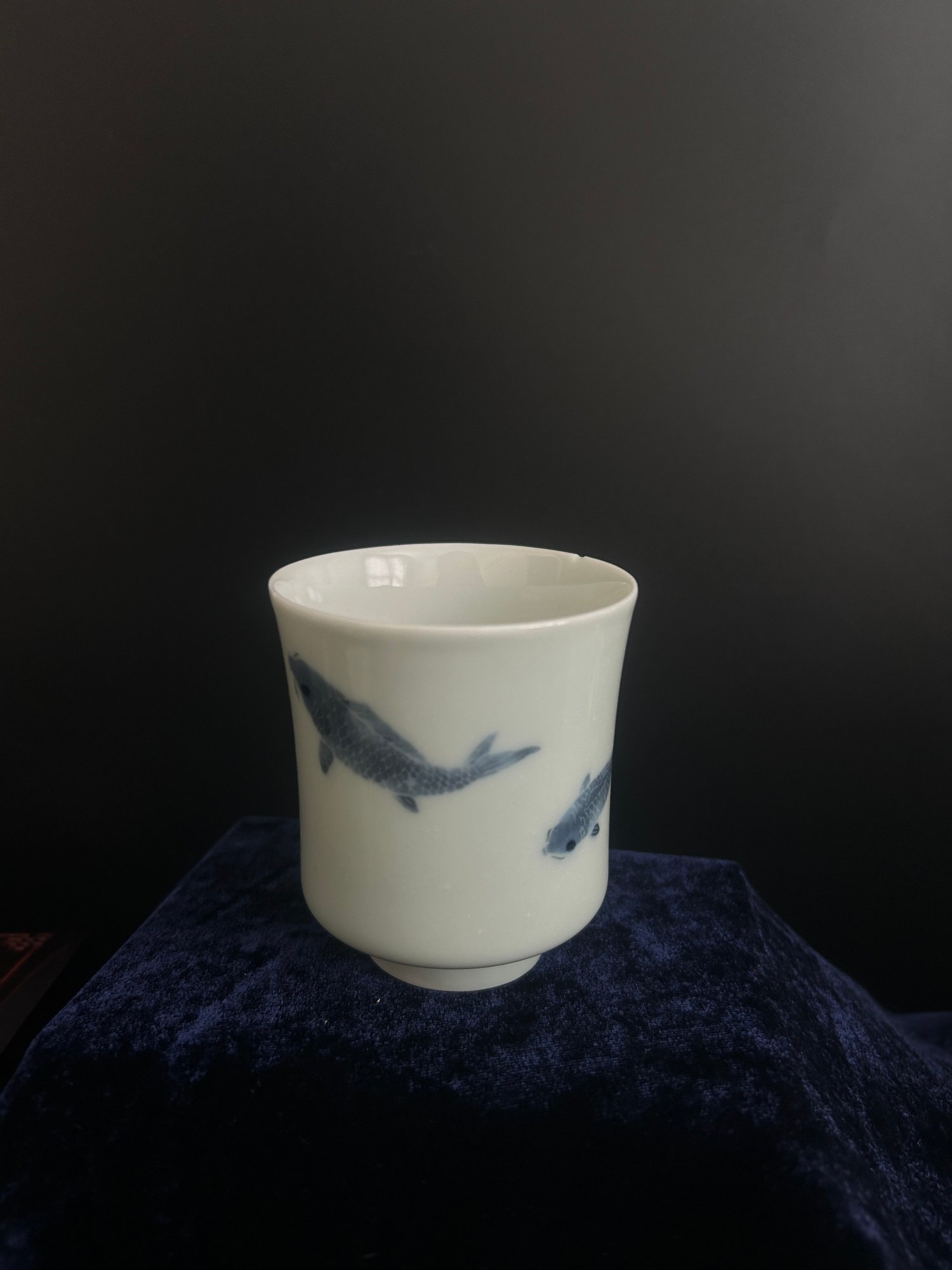 Elegant porcelain cup featuring hand-painted blue fish motif on white ground.