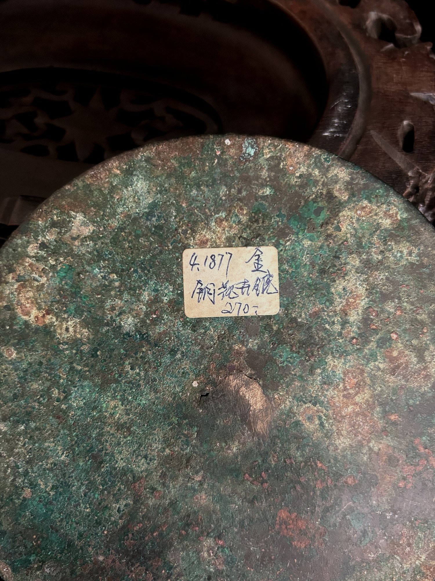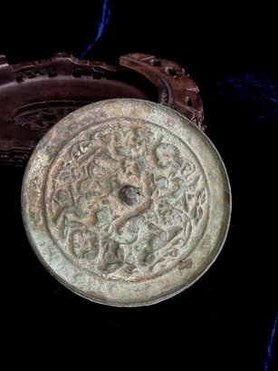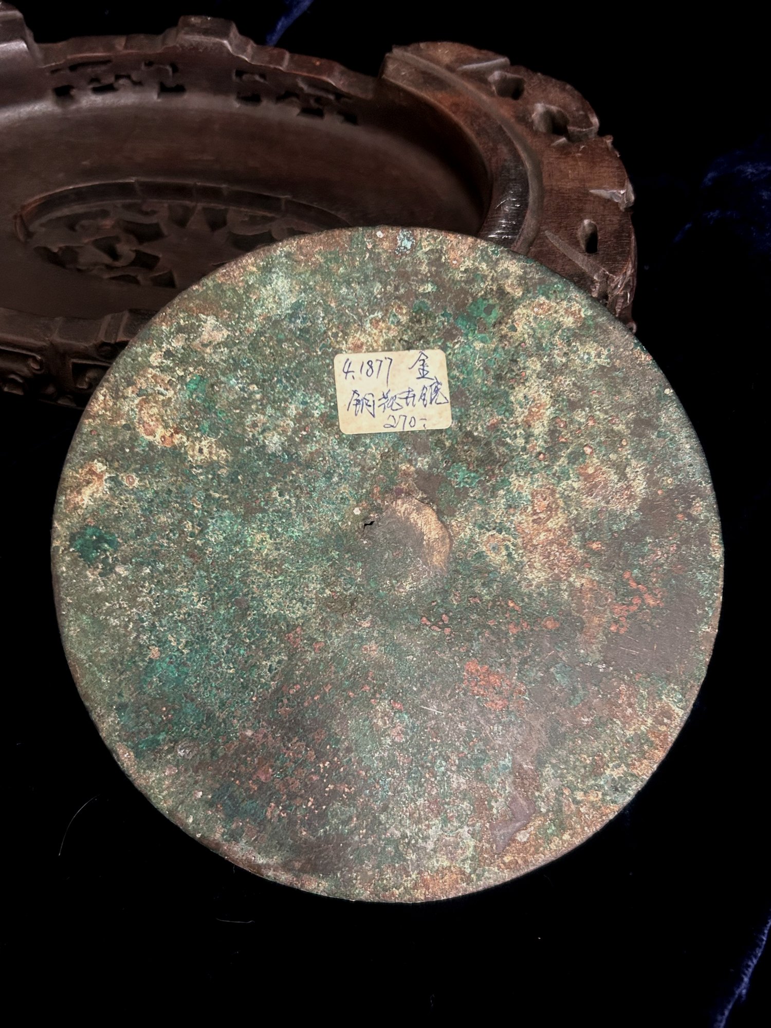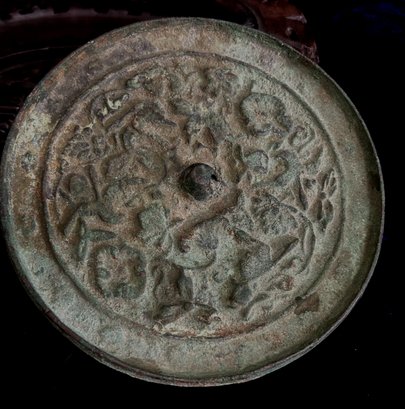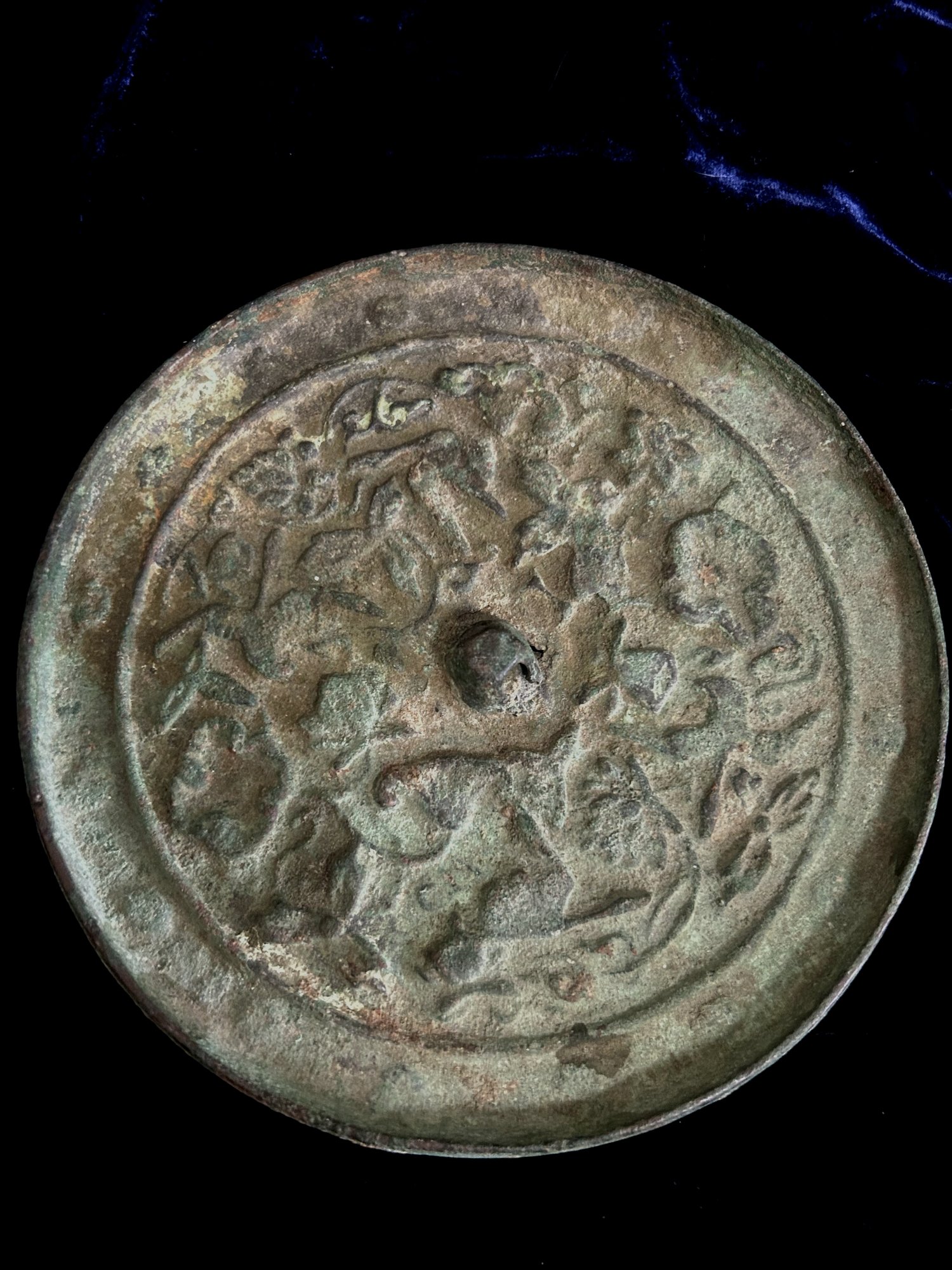 Ancient Chinese bronze mirror, characterized by its round shape and intricate decorative motifs on one side. Bronze mirrors were commonly used in ancient China, particularly during the Han (206 BCE–220 CE), Tang (618–907 CE), and subsequent dynasties. Here's a detailed analysis: