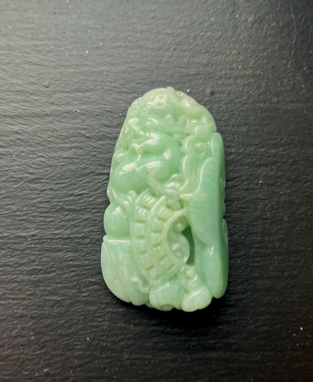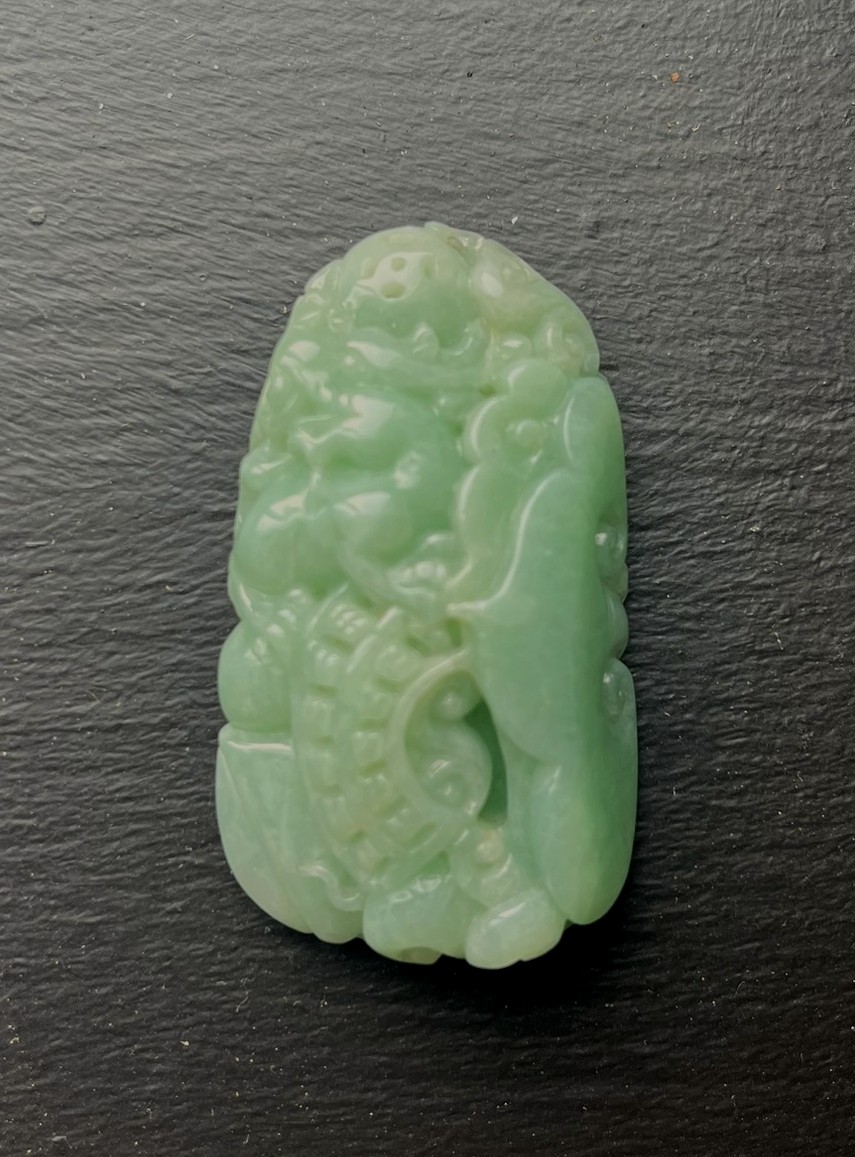 Chinese carved jadeite pendant depicting a traditional auspicious motif, finely worked with detailed relief carving. The jadeite displays a soft green to light bluish-green tone with a smooth, polished surface. The carving shows good depth and craftsmanship, suitable for wearing or collection.