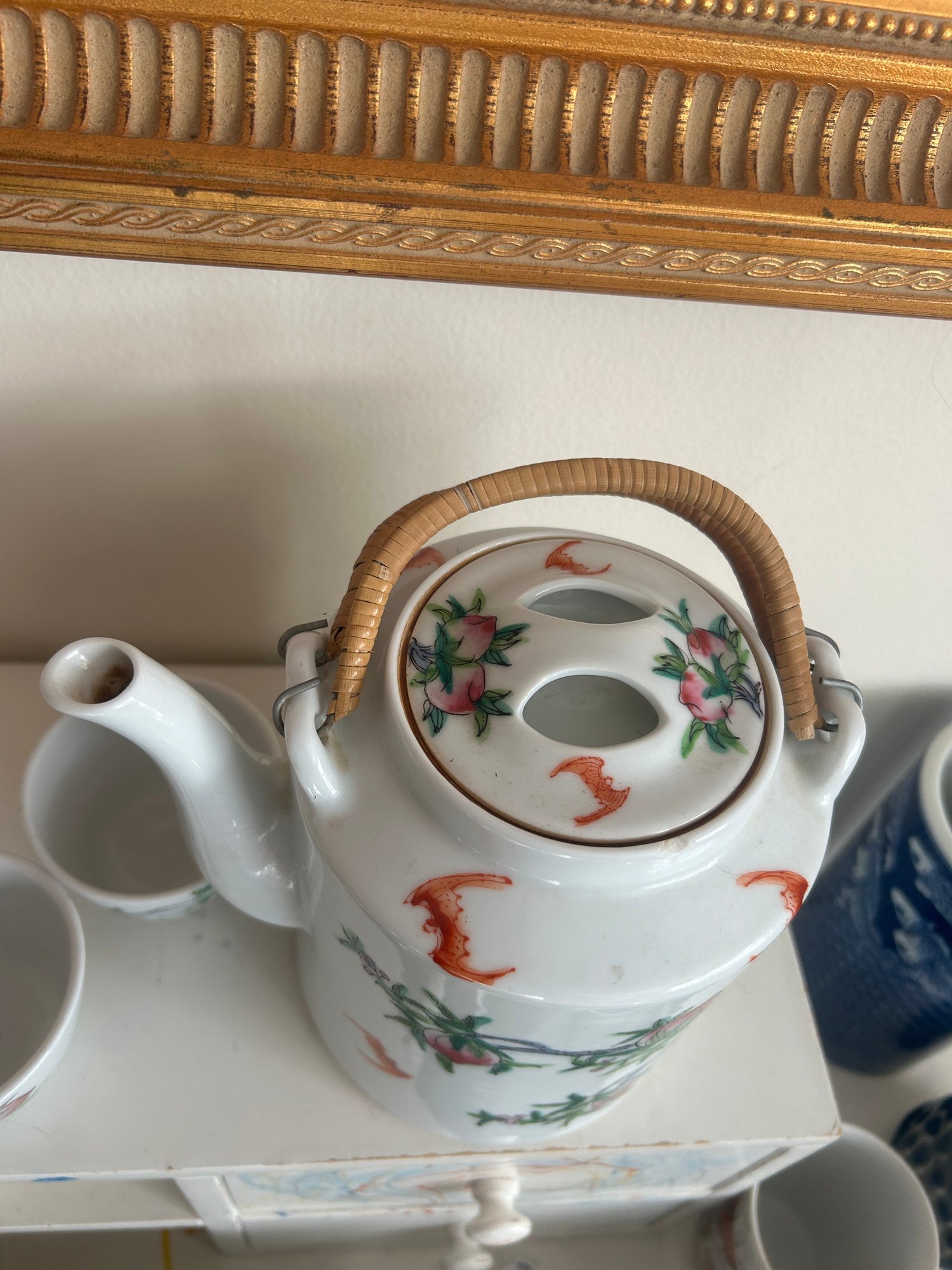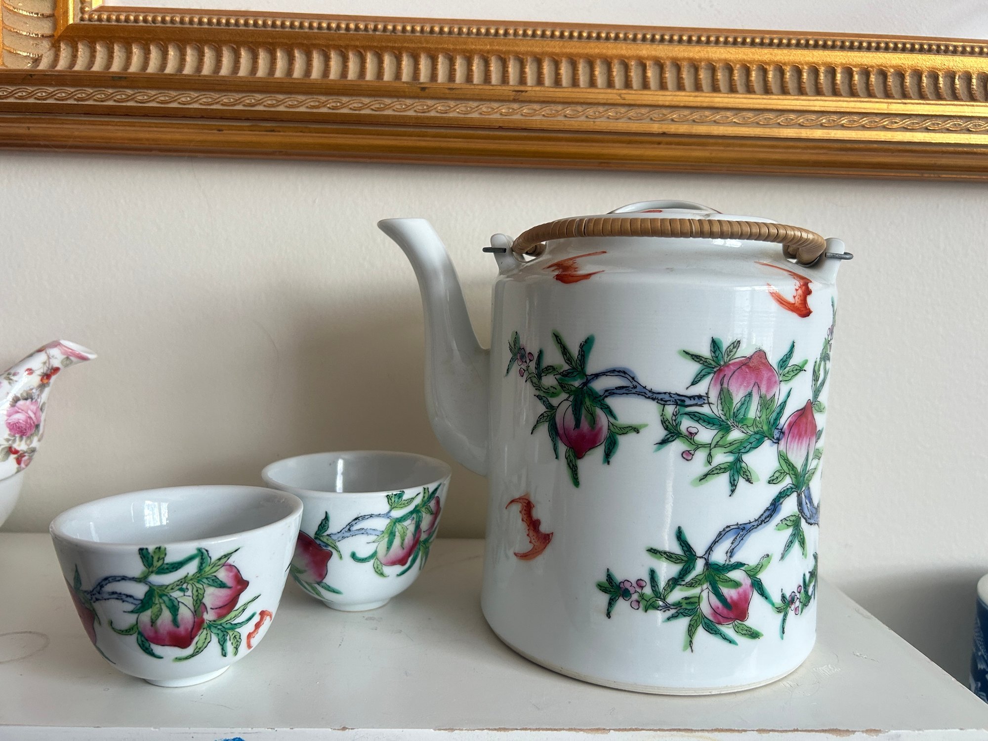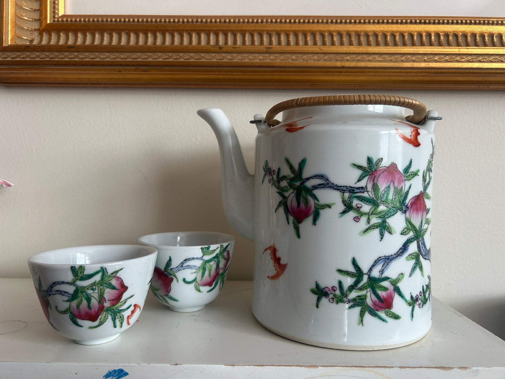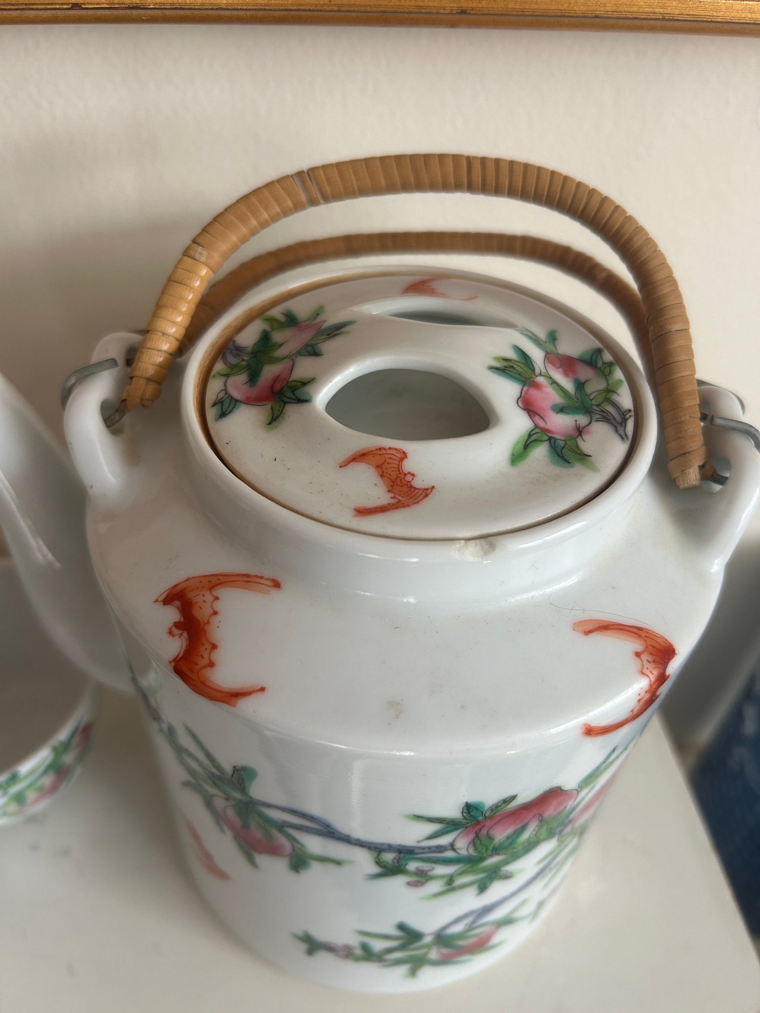 Chinese Porcelain Teapot With Two Cups Peach & Bat Motif, Red Seal Mark