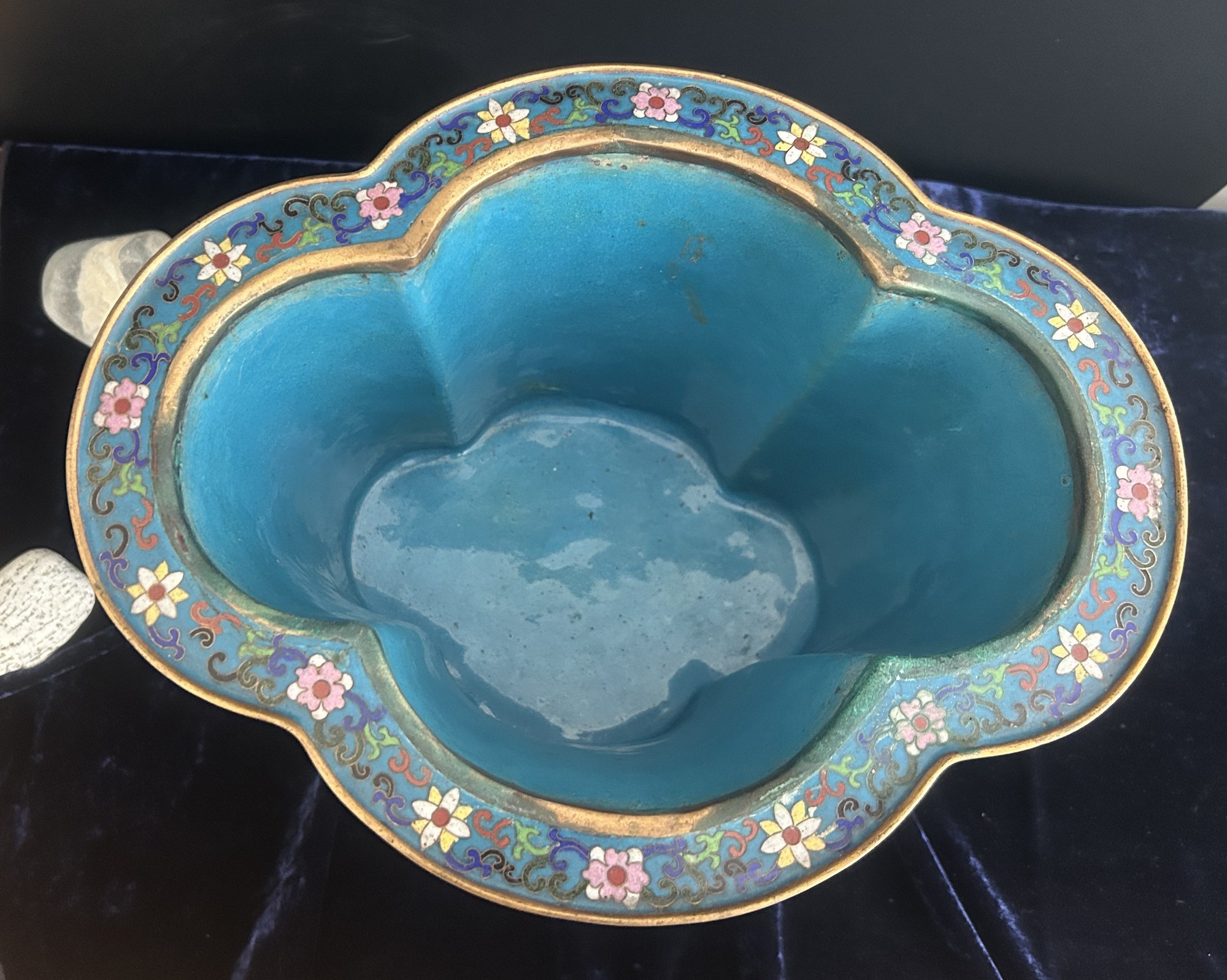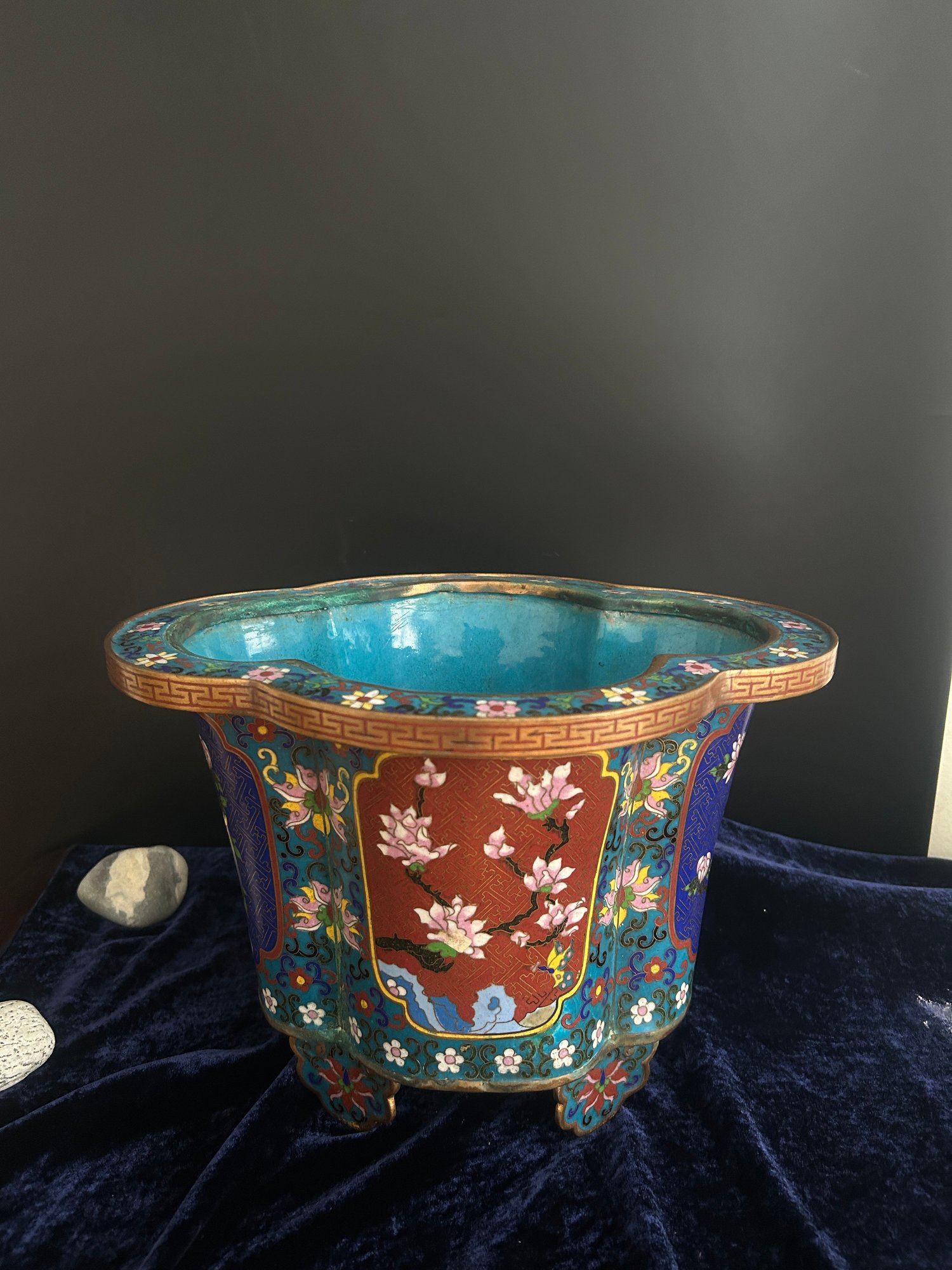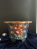Colorful cloisonné planter with floral and bird motif and gilt rim.