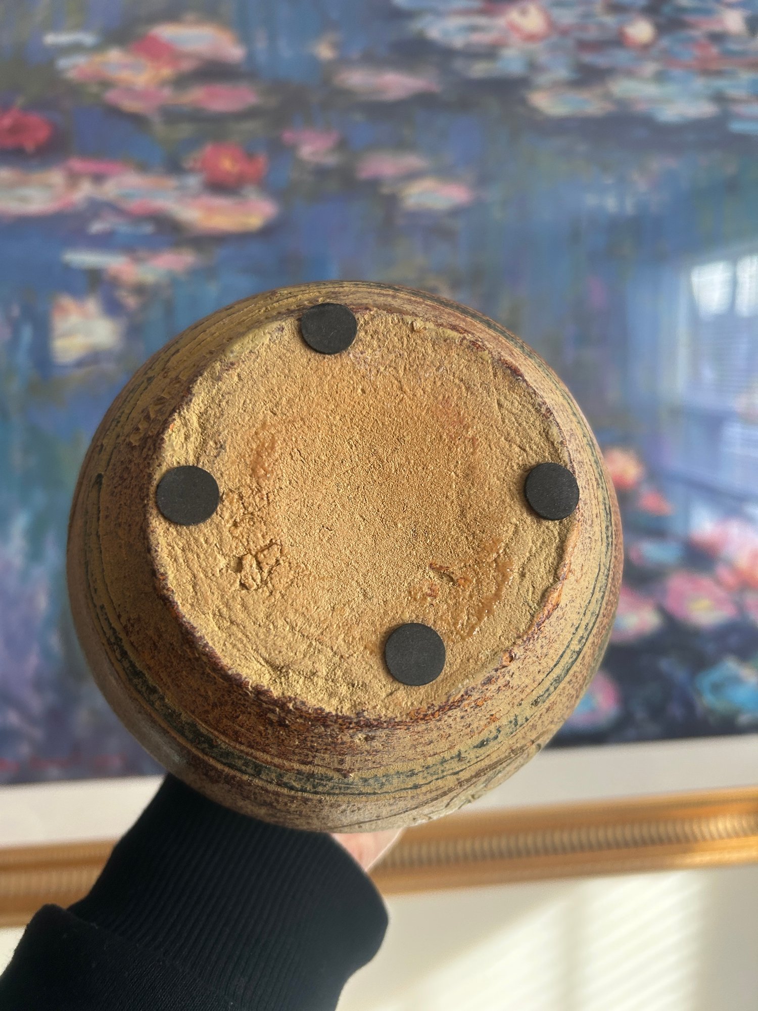 Handcrafted pottery vase with applied twin handles and incised decorative patterns. Earth-toned glaze with rustic finish. No visible maker’s mark. Decorative use.