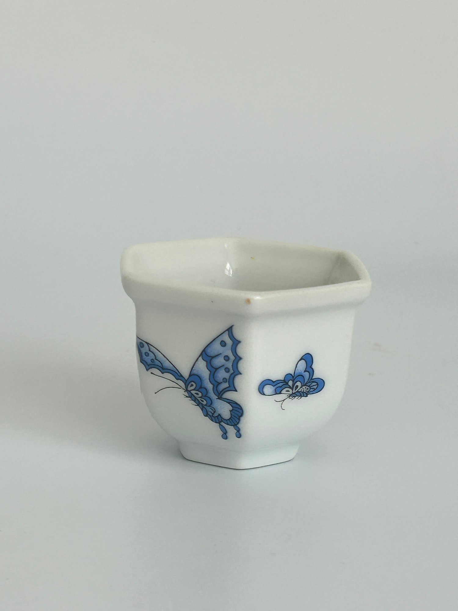 Charming vintage porcelain small vessel featuring delicate hand-painted blue butterfly decoration on a white glazed body. The piece has a unique faceted shape and elegant minimalist design, suitable for display, tea accessories, or small decorative use.