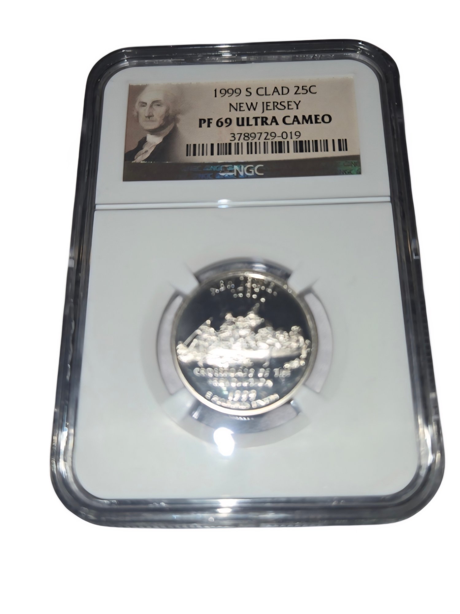 The product is a 1999 S 25C State Quarter from New Jersey, graded PR 69 Ultra Cameo by NGC. This coin is uncirculated, and struck as a proof in the San Francisco Mint. It is a single coin variety from the United States. This certified piece is a valuable addition to any coin collection, showcasing a high grade and the unique design of the State Quarters series. This is an important piece because it's the first presidential quarter that was put out. It's rare to find one in the Ultra cameo MS69 these days. Collectors go Nutz over these, and it's almost a flawless proof.
