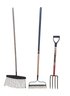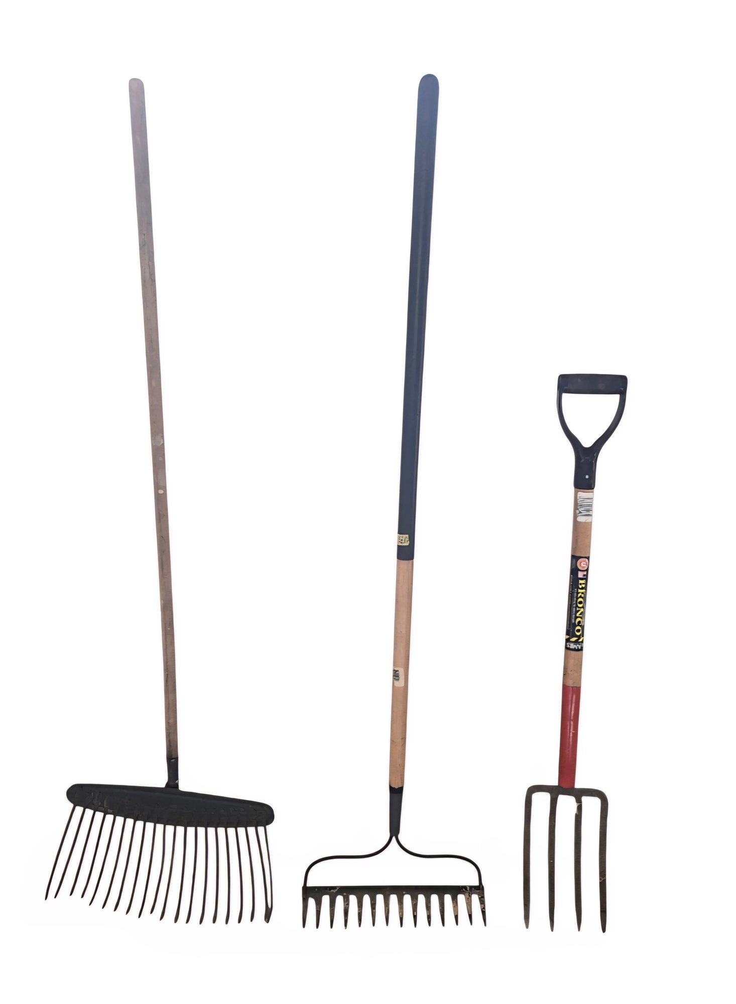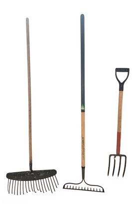 Leaf Rake (Left), Bow Rake (Center),Garden Fork (Right).