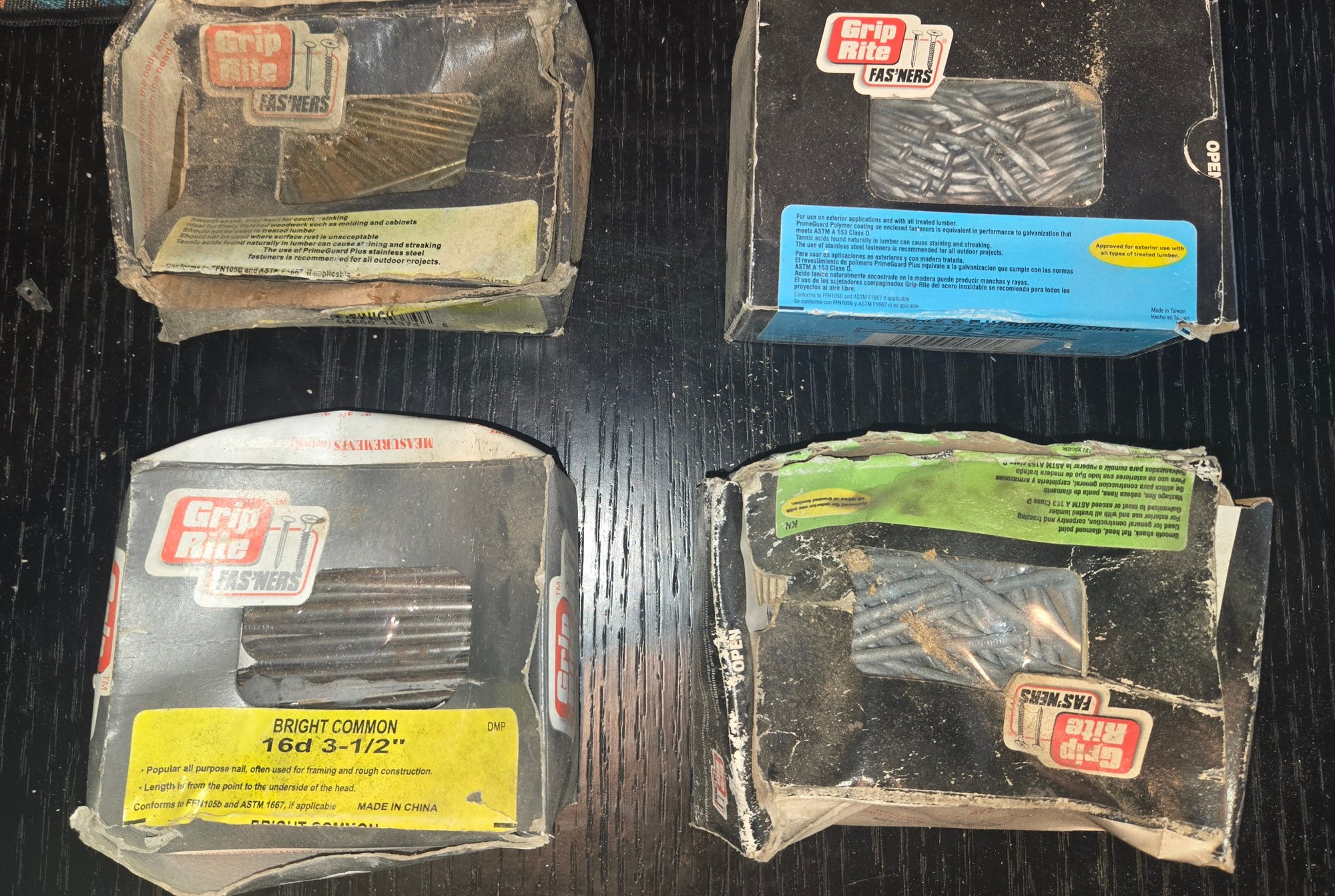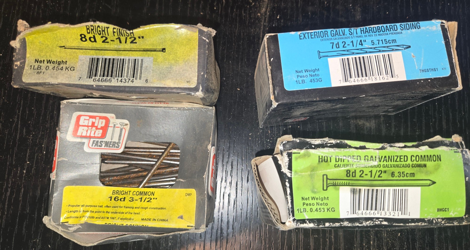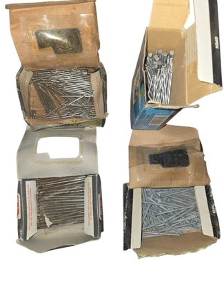 4 - Boxes of nails. All are about halfway full. Various lengths and sizes.