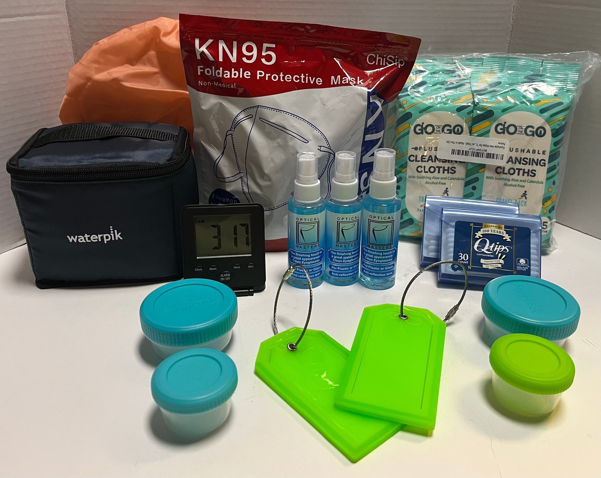 Snap lock containers, lens cleaner spray, cleansing wipes, water pik, protective masks, clock/timer and a shower cap