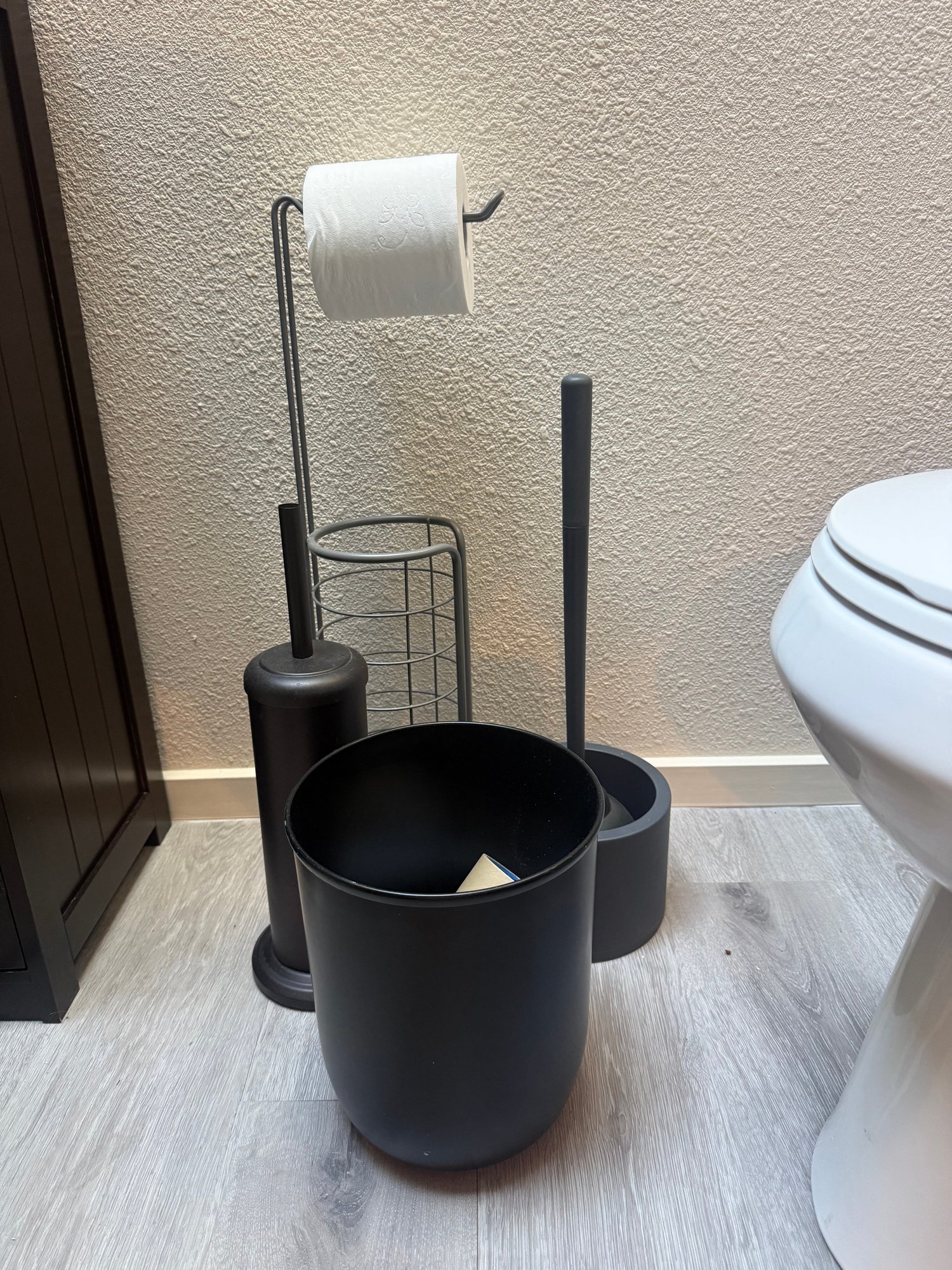 This lot includes one 26” tall silver toilet paper holder, one metal black 10” tall 8” wide trash can, one black 20” tall toilet plunger, and one brown 17” tall toilet bowl brush , all items pre owned and sizes are approximate.