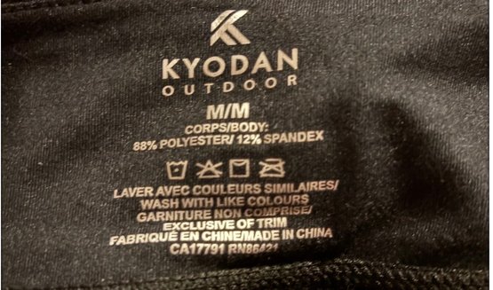 Medium, made of an 88% polyester and 12% spandex blend. The garment is machine washable with like colors and made in China.
