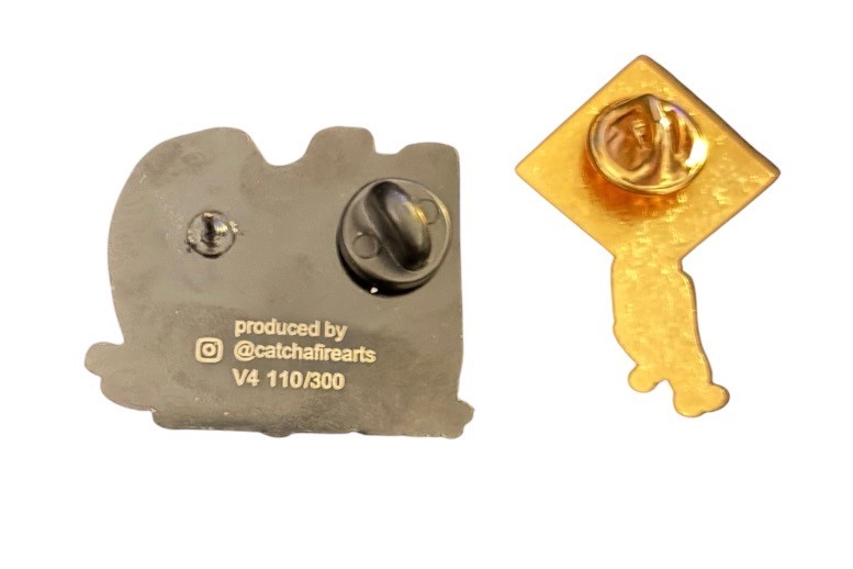 The second pin is a "Management in the Environmental Era" commemorative piece, designed as a diamond-shaped traffic sign.