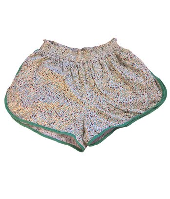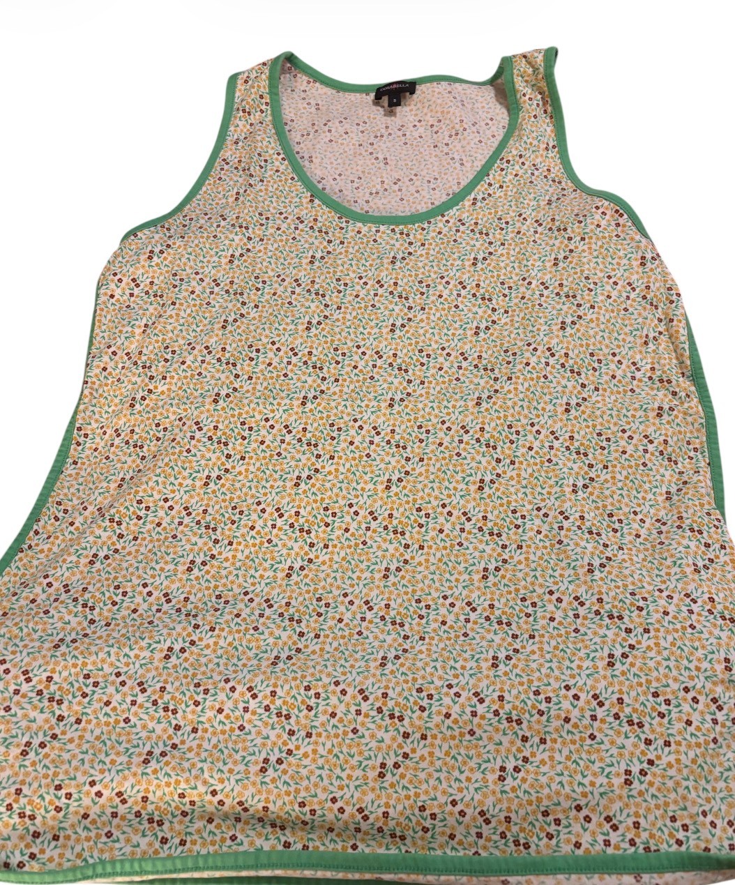 Cosabella size small specifically an item from one of their sleepwear or loungewear collections, likely the "Bella" line. It features a white or off-white background with a tiny floral print in yellow, brown, and green, and has green piping (lettuce trim) around the neckline