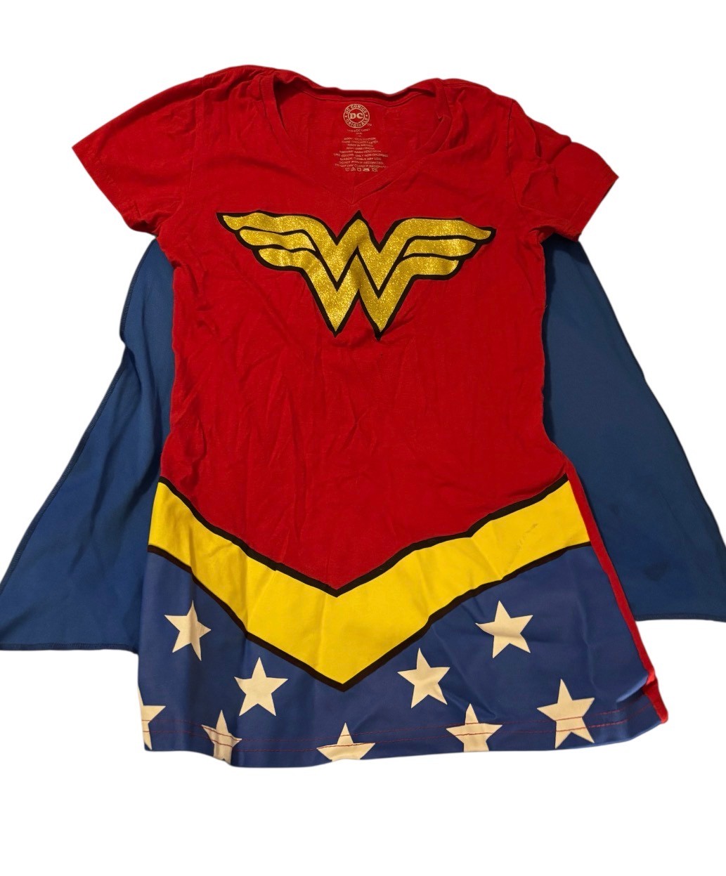 DC Comics Wonder Woman V-neck costume t-shirt featuring a detachable blue cape. Size Medium