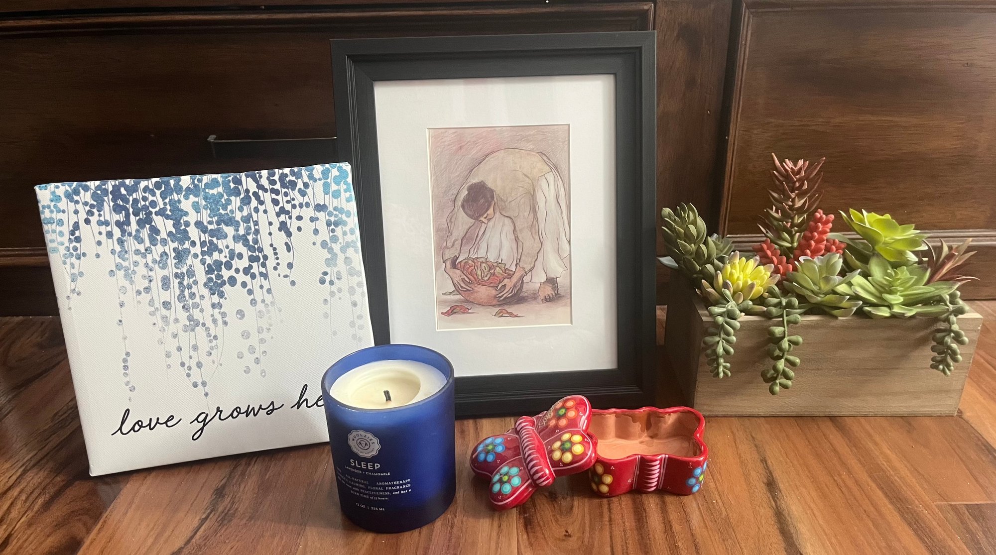Assorted decor, three small, framed nature photos, cactus basket, cute storage box. A candle and a cute little trinket box.