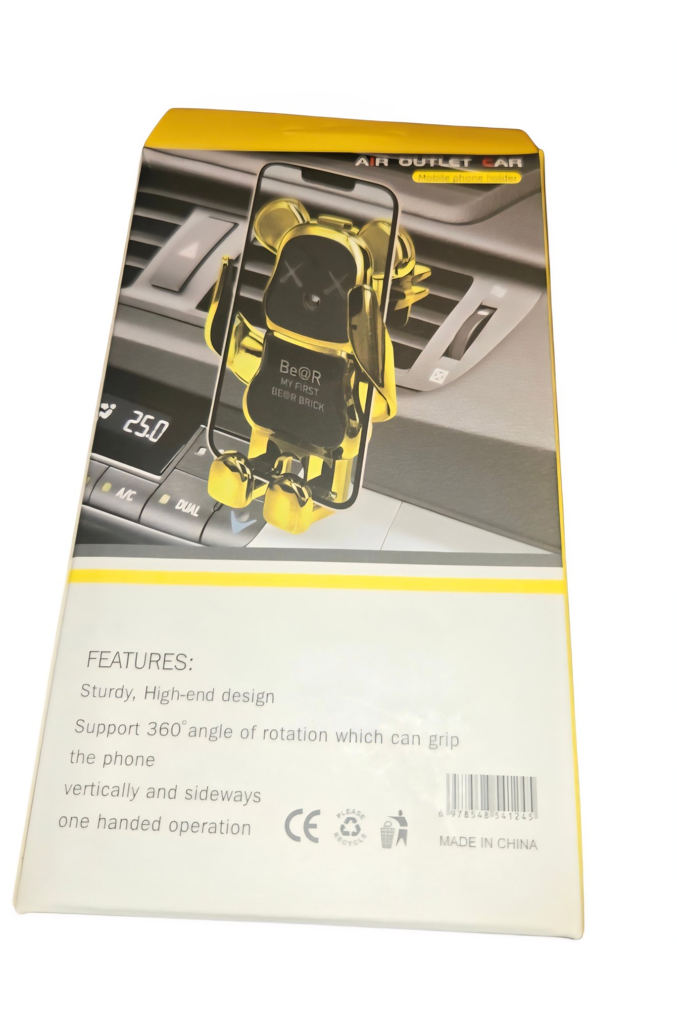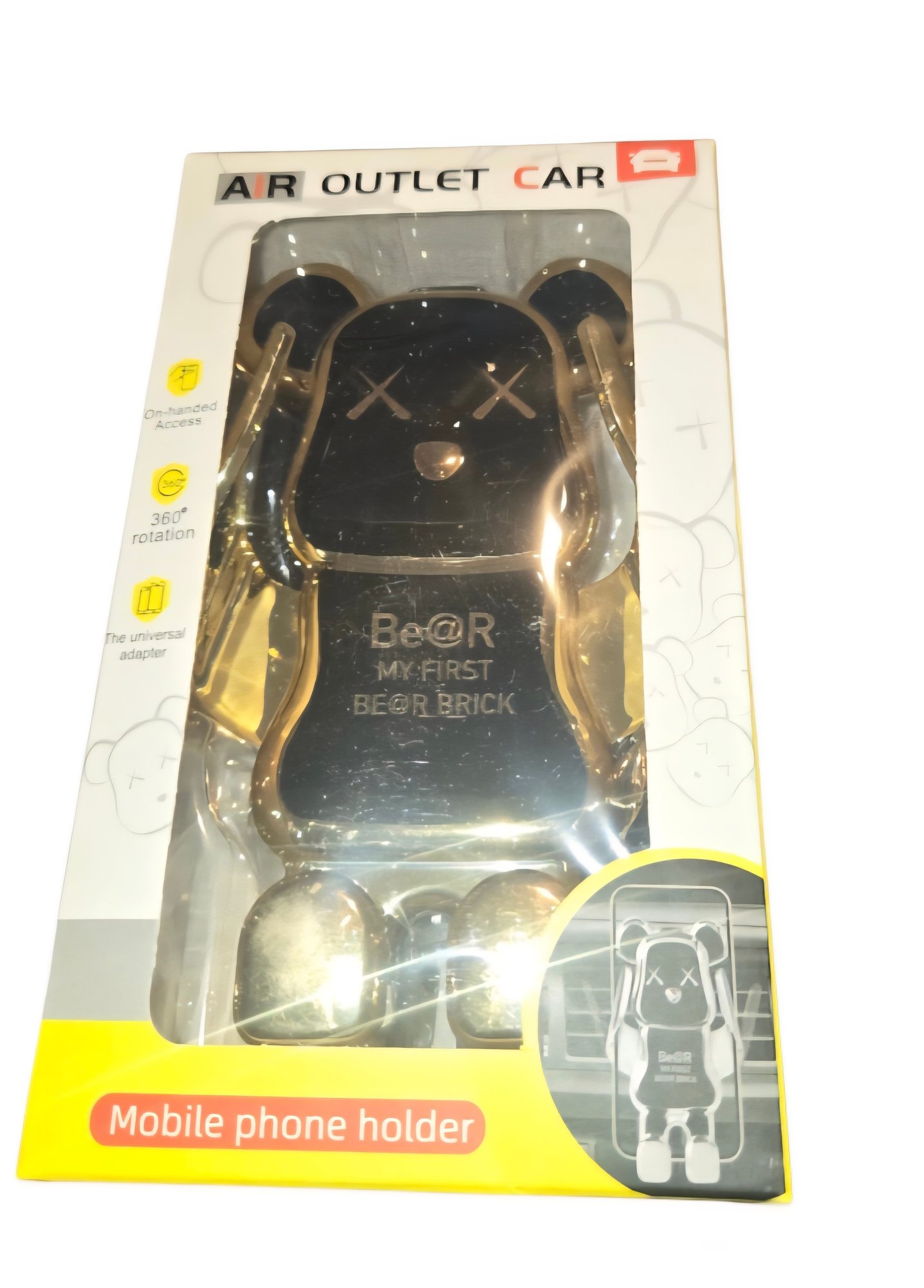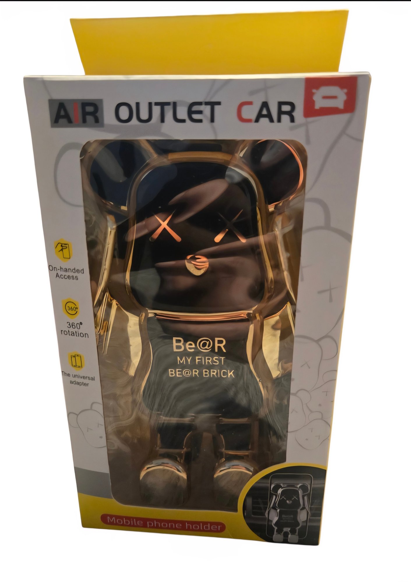 New-Bear-shaped air vent phone holder designed to look like a Be@rbrick figure. In a Gold color.