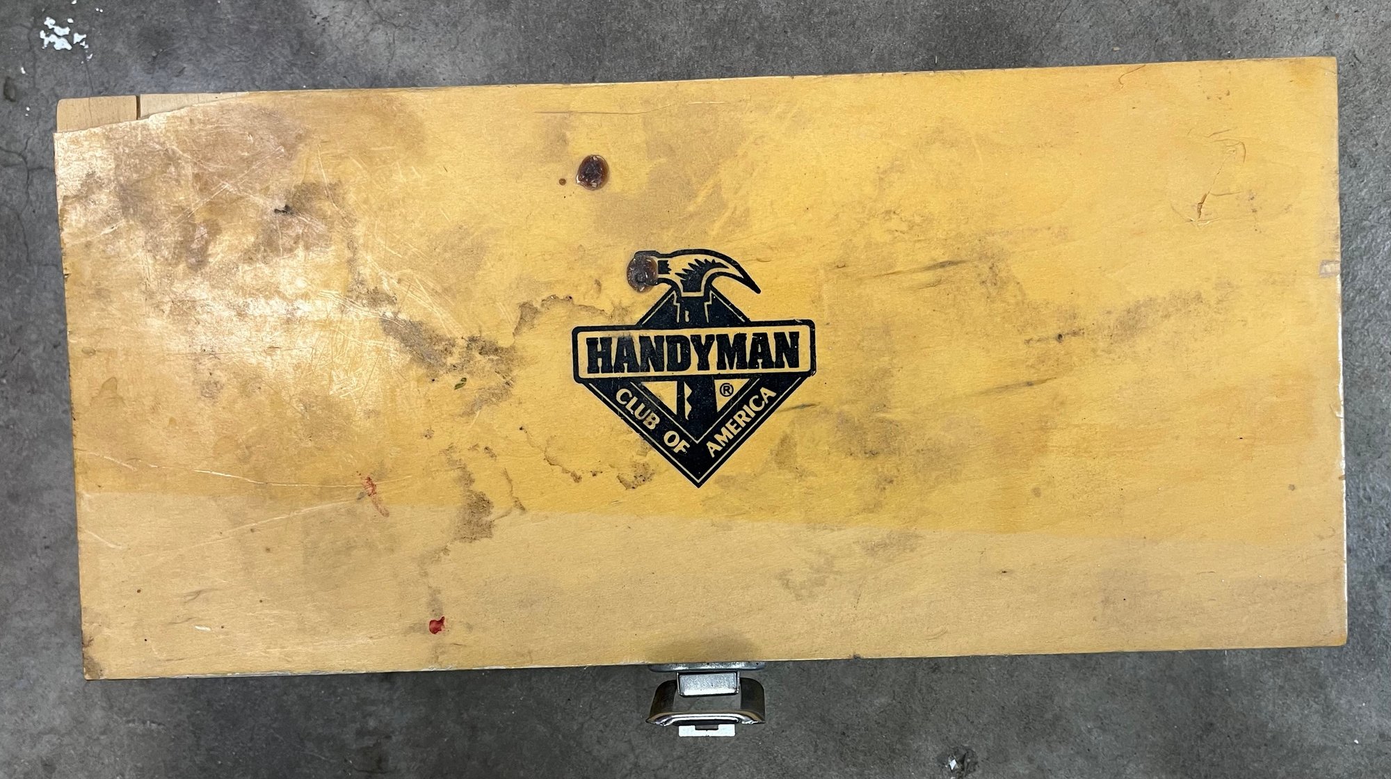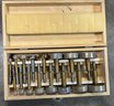The image shows a set of Forstner drill bits in a wooden case. These tools are used for woodworking to create clean, flat-bottomed holes.