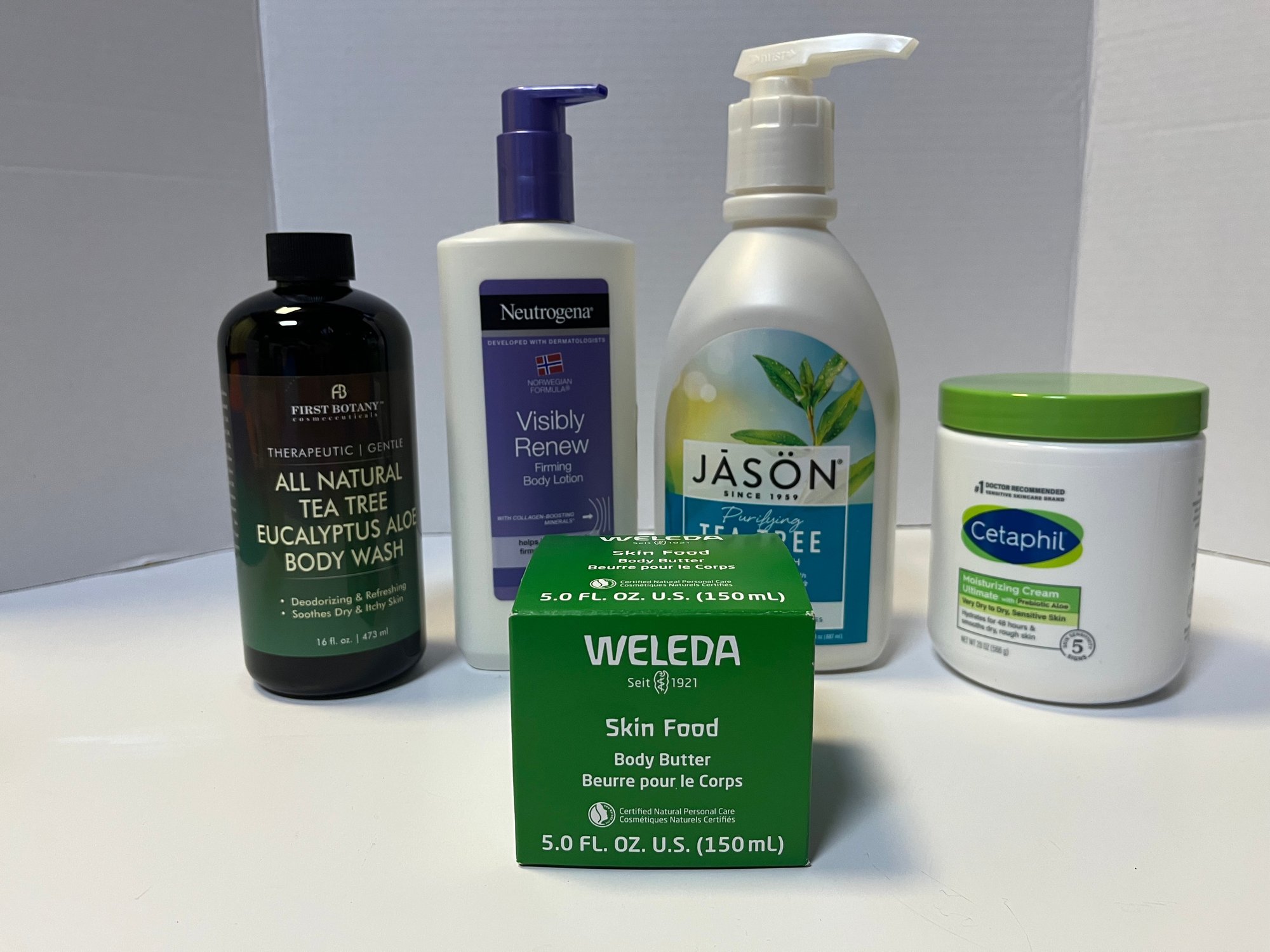 Cetaphil moisturizing cream 20oz. Jason body wash 30oz. Neutrogena body lotion 13oz. First botany body wash 16oz Weleda body butter 5oz.