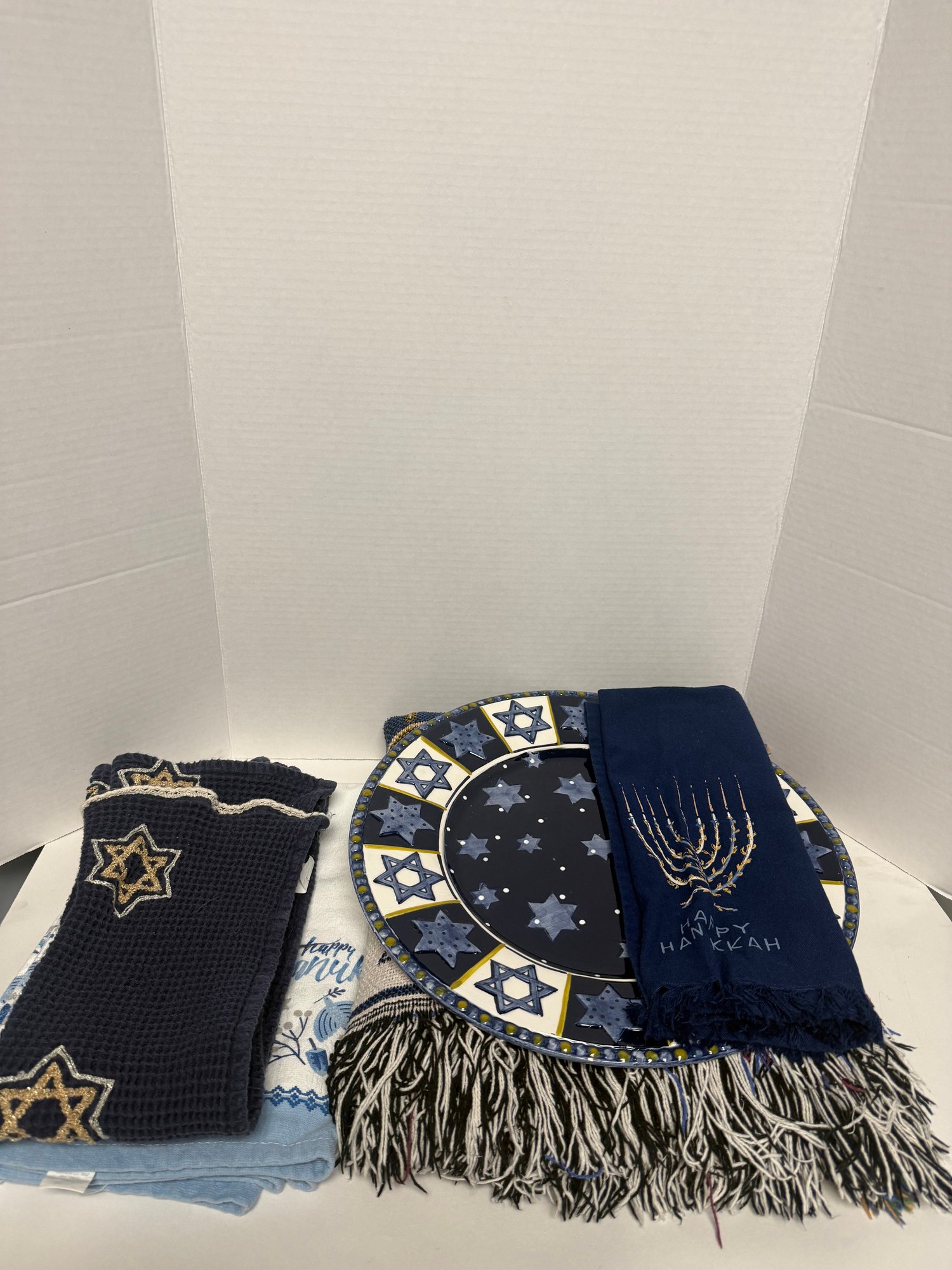 This lot includes a “Hanukah” 11” x 1” x 3” candle holder, one 14.5” round plate, 5 different towels, one blanket. All items pre owned.