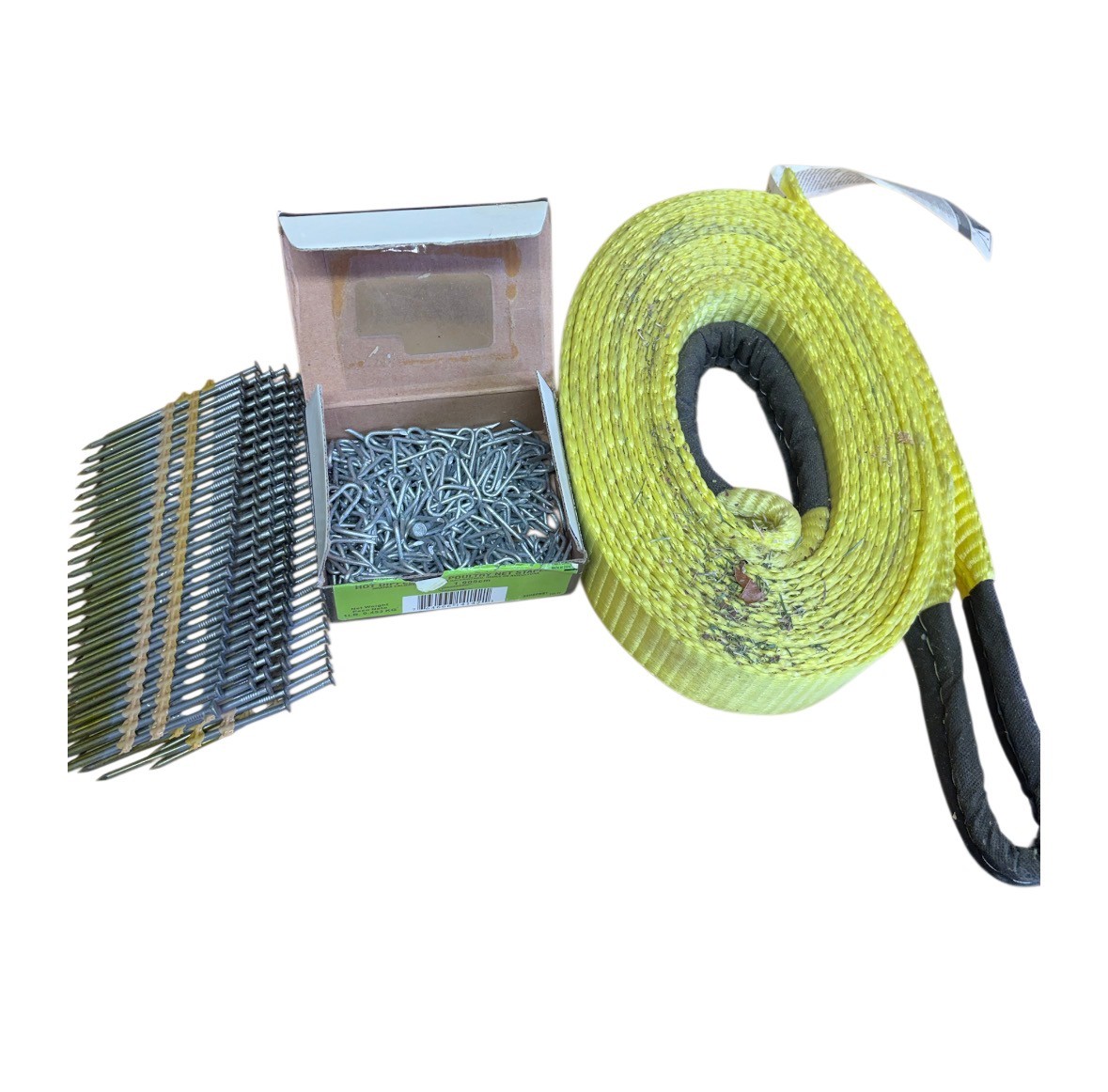 The long, yellow item is likely a heavy-duty tow or recovery strap, used for pulling vehicles or heavy loads.