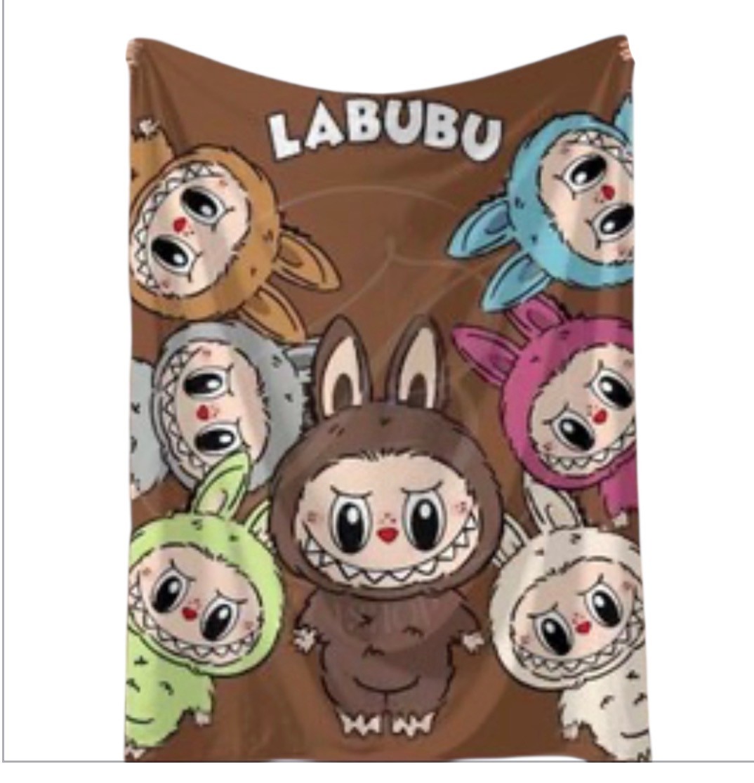 "The Monsters" series created by artist Kasing Lung and marketed by Pop Mart. These blankets feature the character Labubu, a mischievous-looking monster elf with large ears and serrated teeth, in various colors and designs