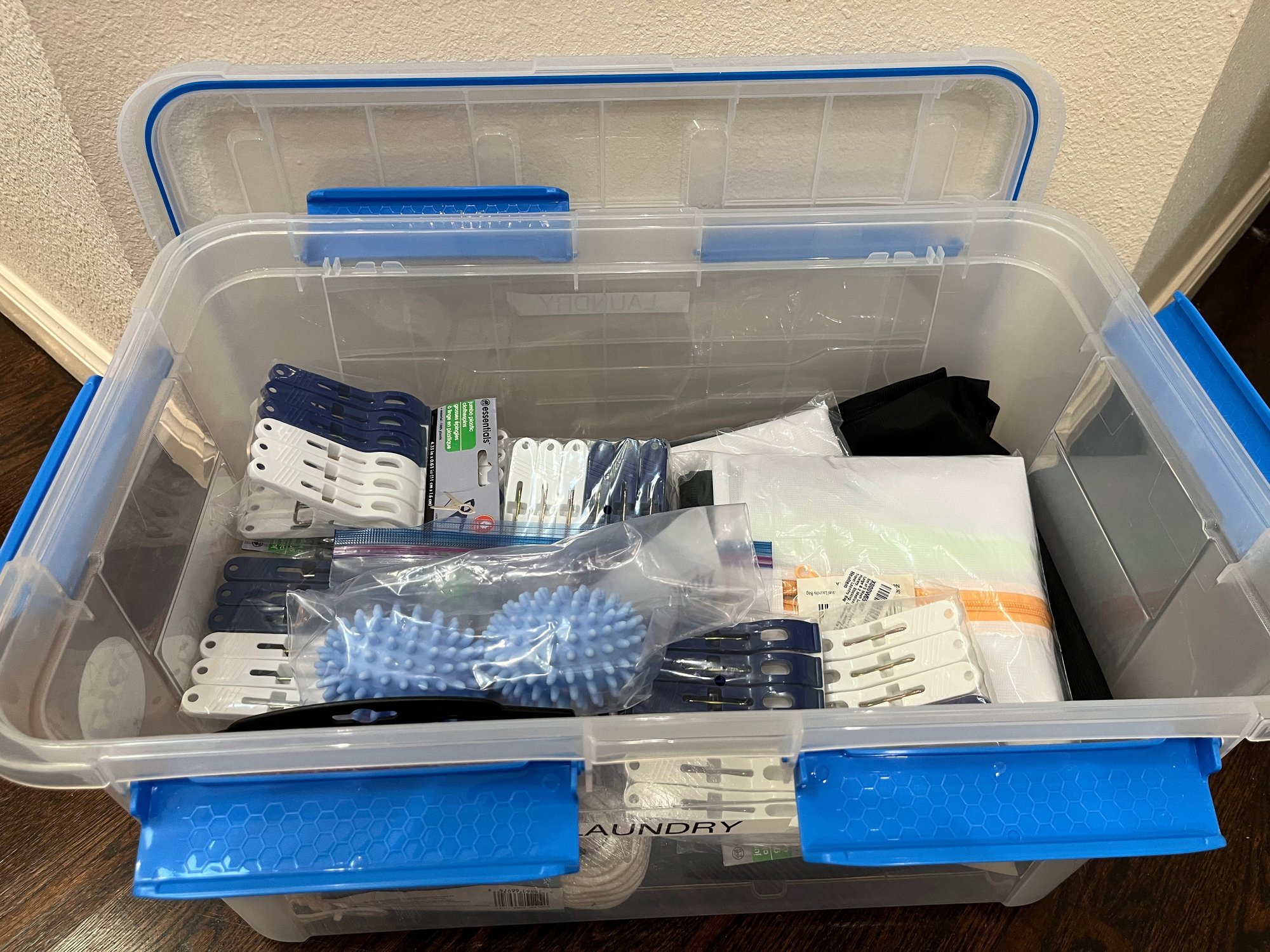 Jumbo plastic clothespins, laundry bags for washing and rope for hanging laundry with tote