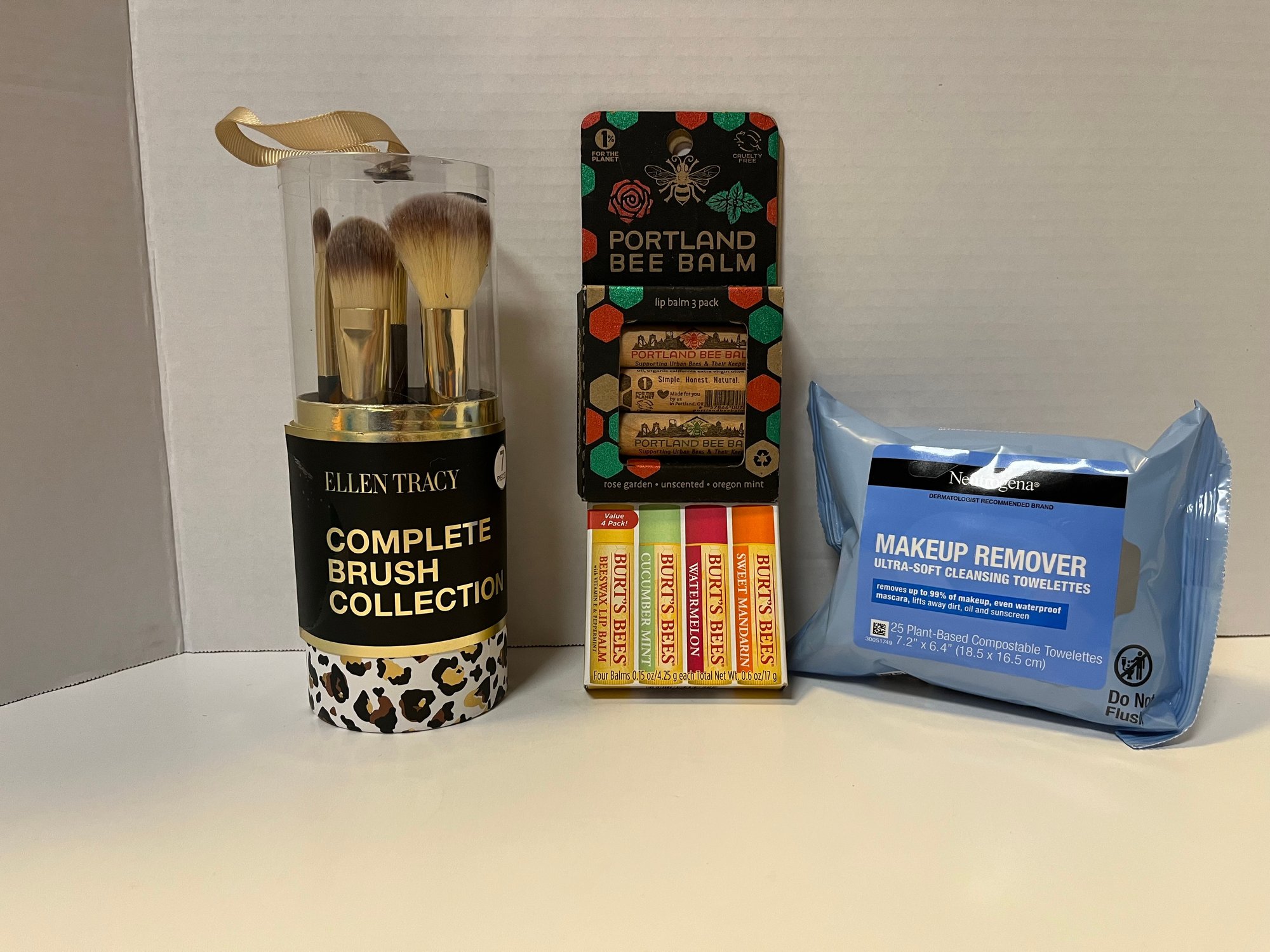 Set of brushes, burts bees lip balm, Portland lip balm and make up remover wipes