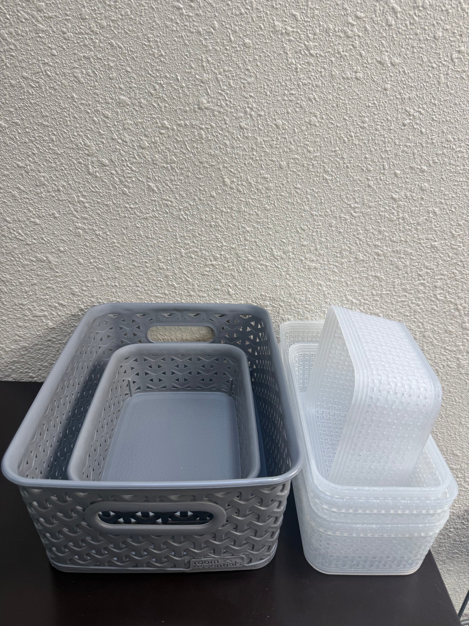 These 6 baskets are pre owned and different sizes, two are grey and 4 are white/ clear with sparkles.