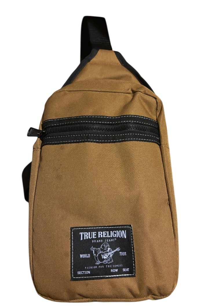 It is a stylish and functional crossbody bag designed for men, made from durable polyester with a solid tan color. Adjustable strap & pocket. Like new.