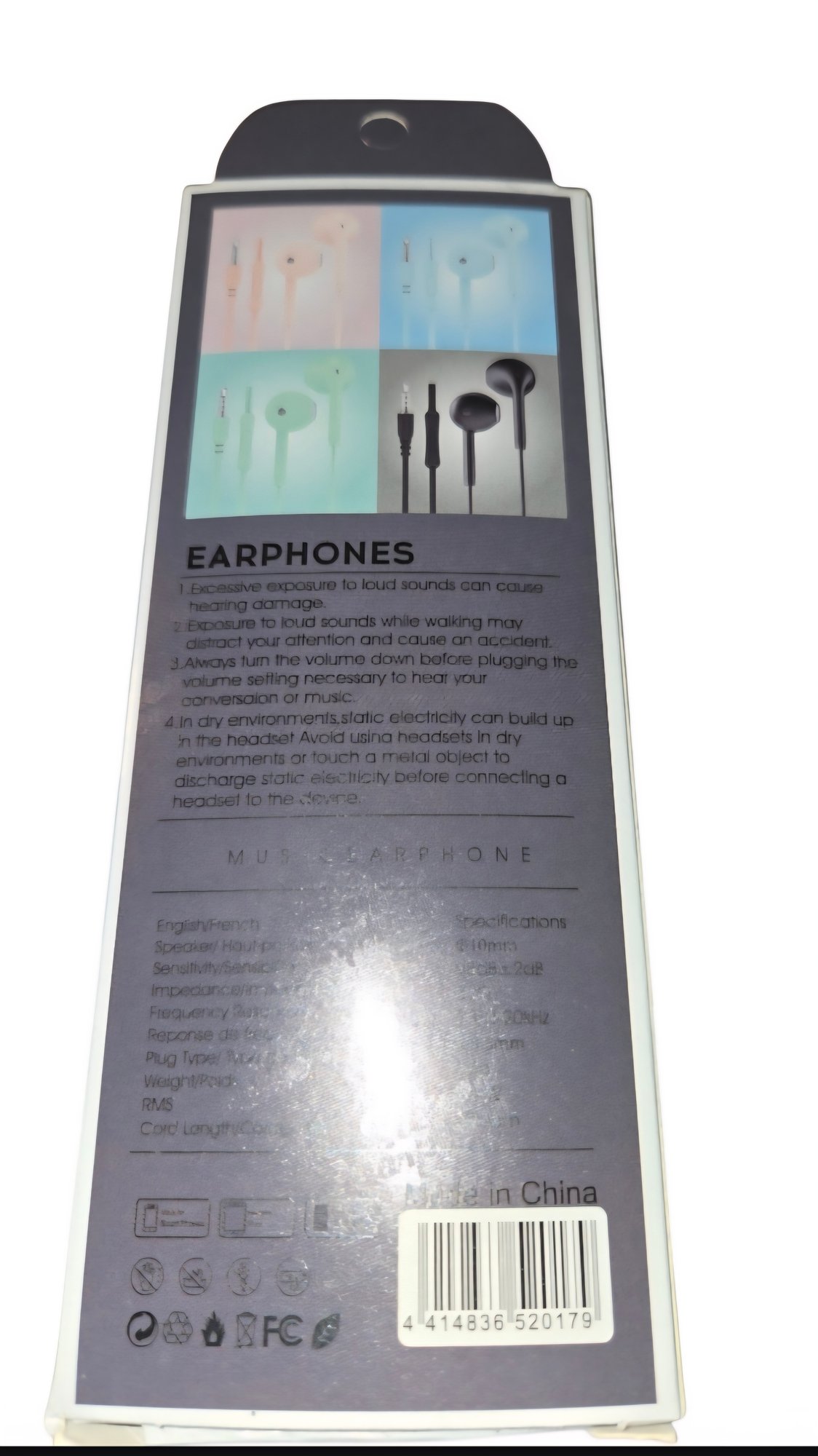 The design is in-ear and offers noise canceling capabilities. Black in color. As seen in photo there is some damage to the box.