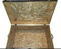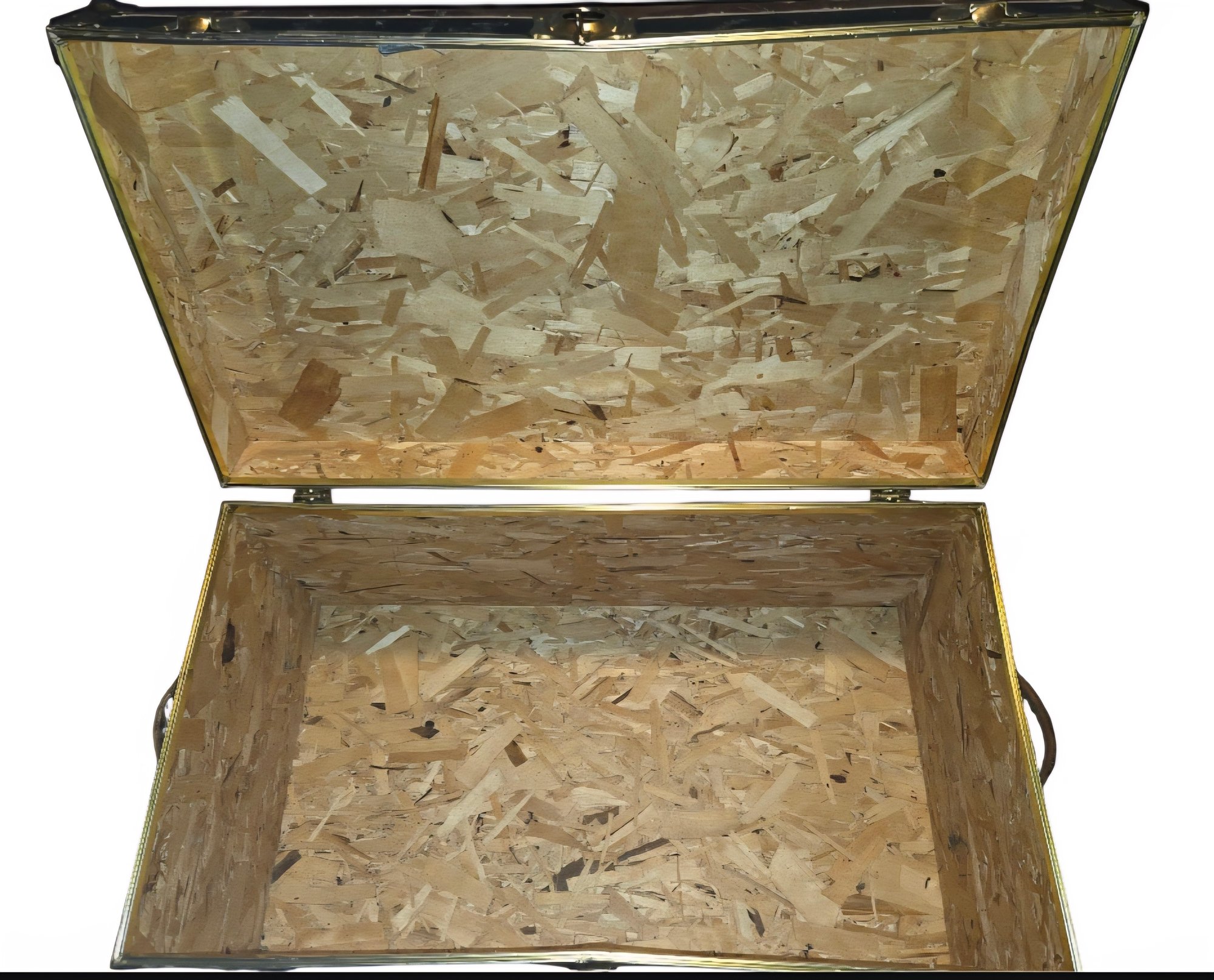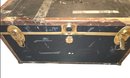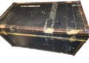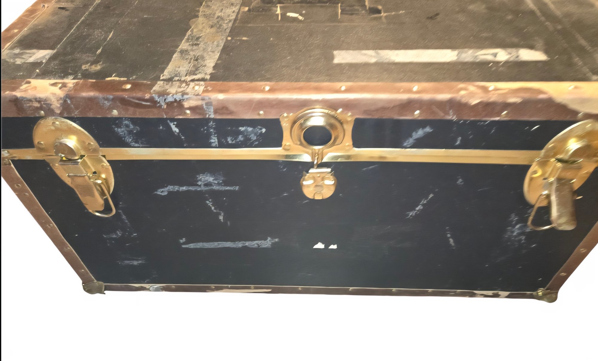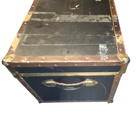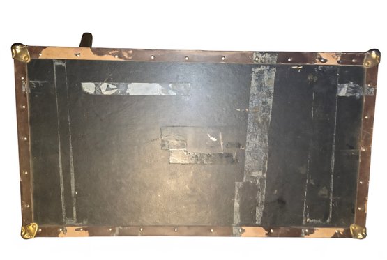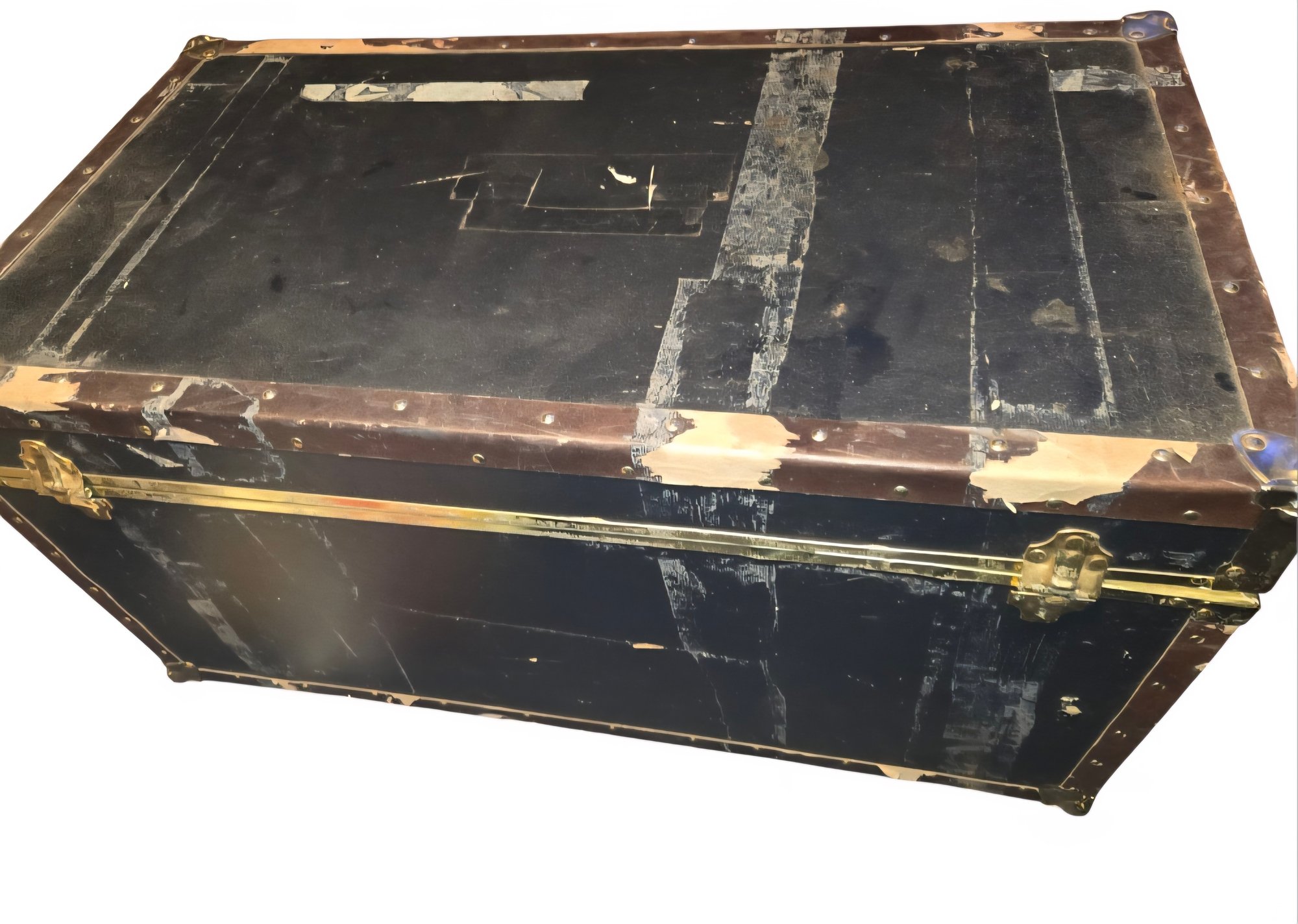 Vintage steamer trunk typically made of wood and covered with materials like canvas or metal, featuring brass hardware and a flat top for easy stacking during travel on steam-powered ships.