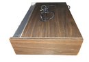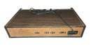 The device has a wood-grain finish and a black faceplate with silver accents.