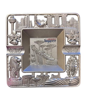 It features embossed designs of popular Singaporean landmarks, including the Merlion statue, Marina Bay Sands hotel, Singapore Flyer, Gardens by the Bay, and the Singapore skyline.