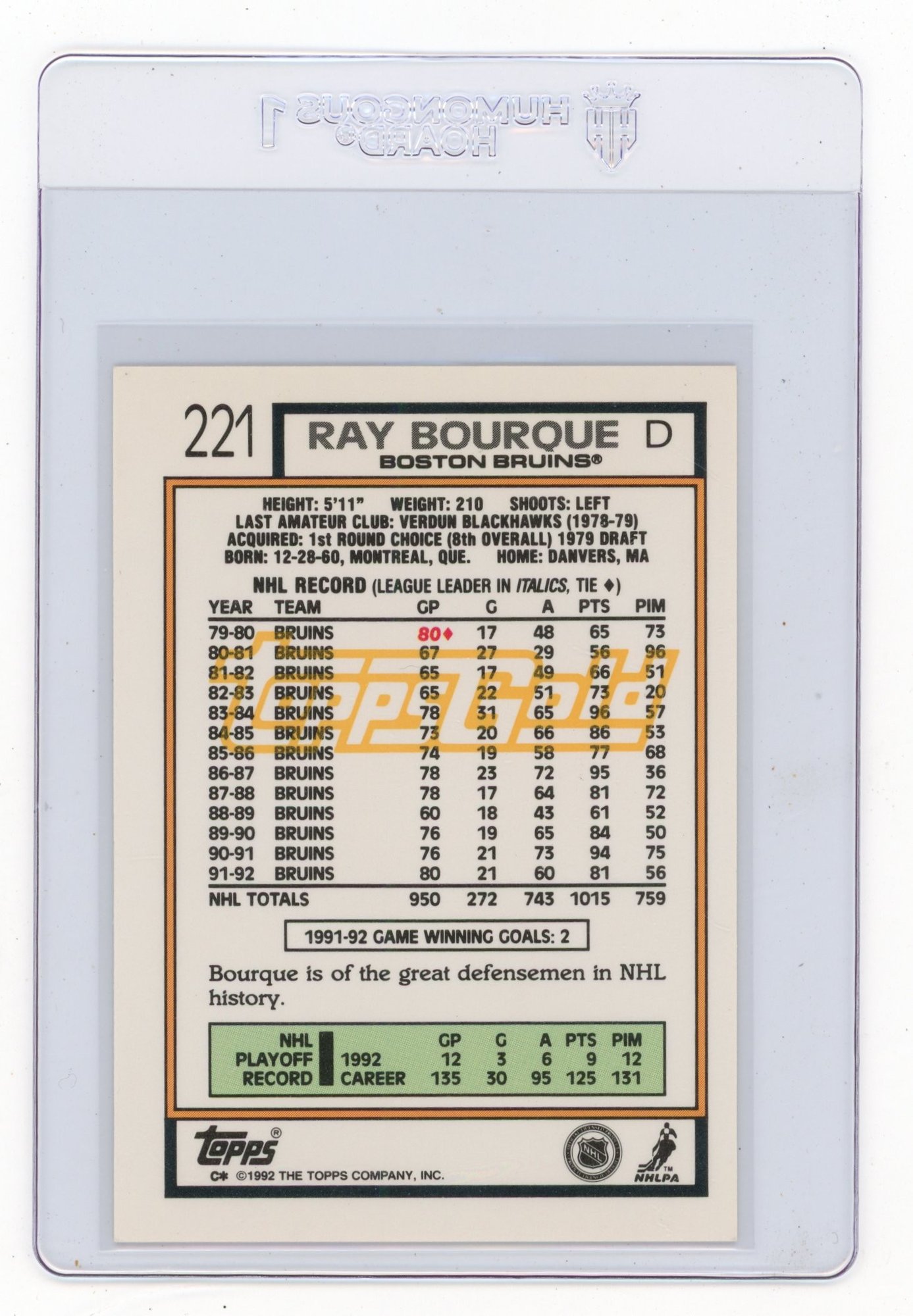 1992 Topps Gold Ray Bourque Hockey Card