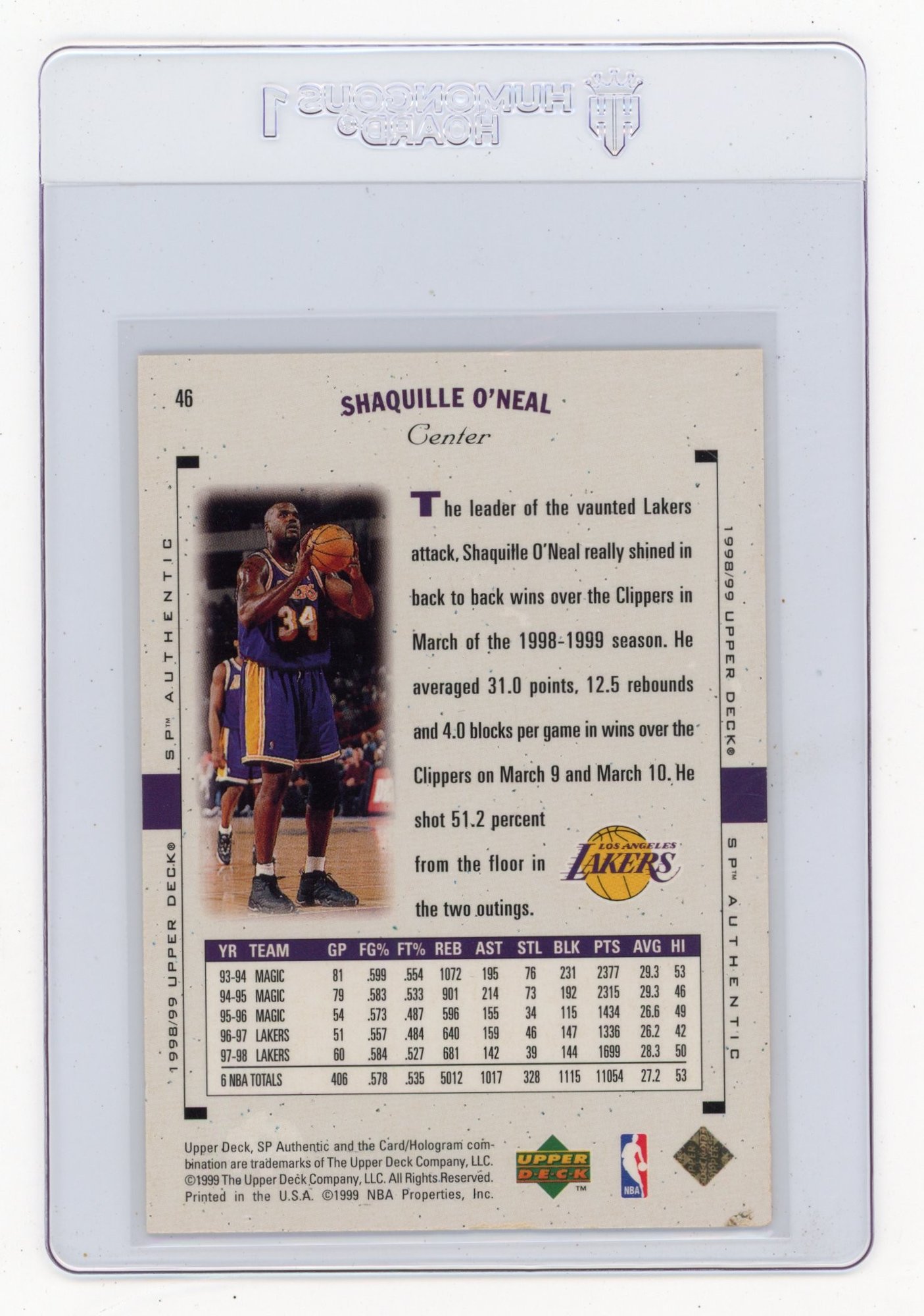 1998 Upper Deck SP Authentic Shaquille O'Neal Basketball Card