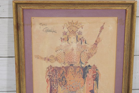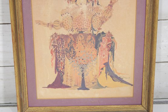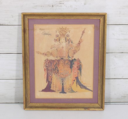 This striking composition features a richly adorned mythological figure with elaborate costume, intricate patterns, and flowing forms. Wiinblad’s distinctive aesthetic blends whimsy with classical inspiration, using warm tones of gold, peach, and muted reds to create a highly stylized and elegant image.